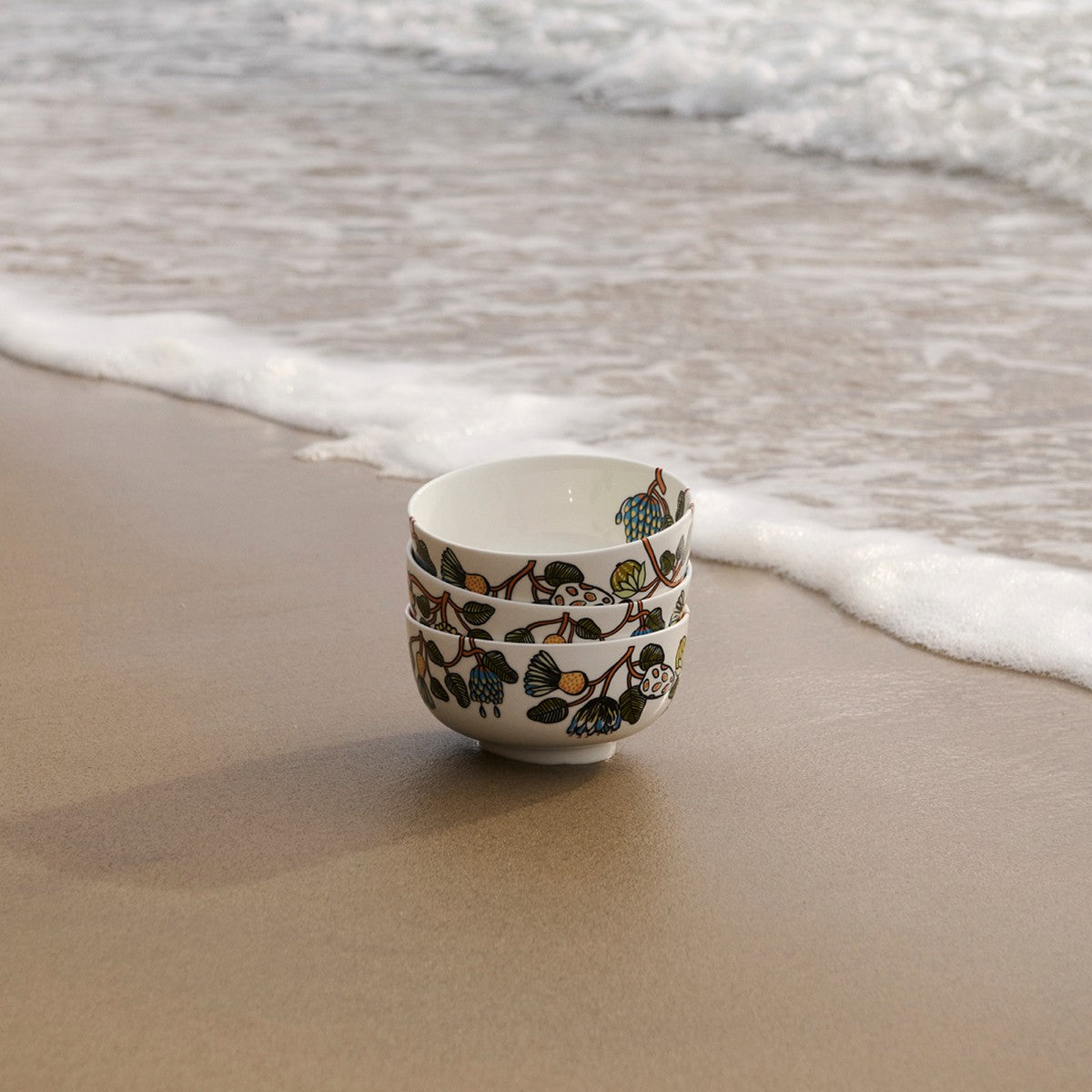 Combining modern florals with vintage appeal, Erja Hirvi's lush Tiara pattern brings in the beauty of nature to any interior. Plants and flowers vine from the outside of this Marimekko serving bowl through the inside in sun-kissed hues of orange, green and blue. Illuminating the table and bringing joy to everyday dining, pass this serving bowl around the table for bread and other appetizers, or, use a decorative fruit bowl in the kitchen; the whimsical pattern and warm colors offer endless opportunities in the home. The Marimekko Tiara Serving Bowl is made from durable white stoneware and is dishwasher safe.