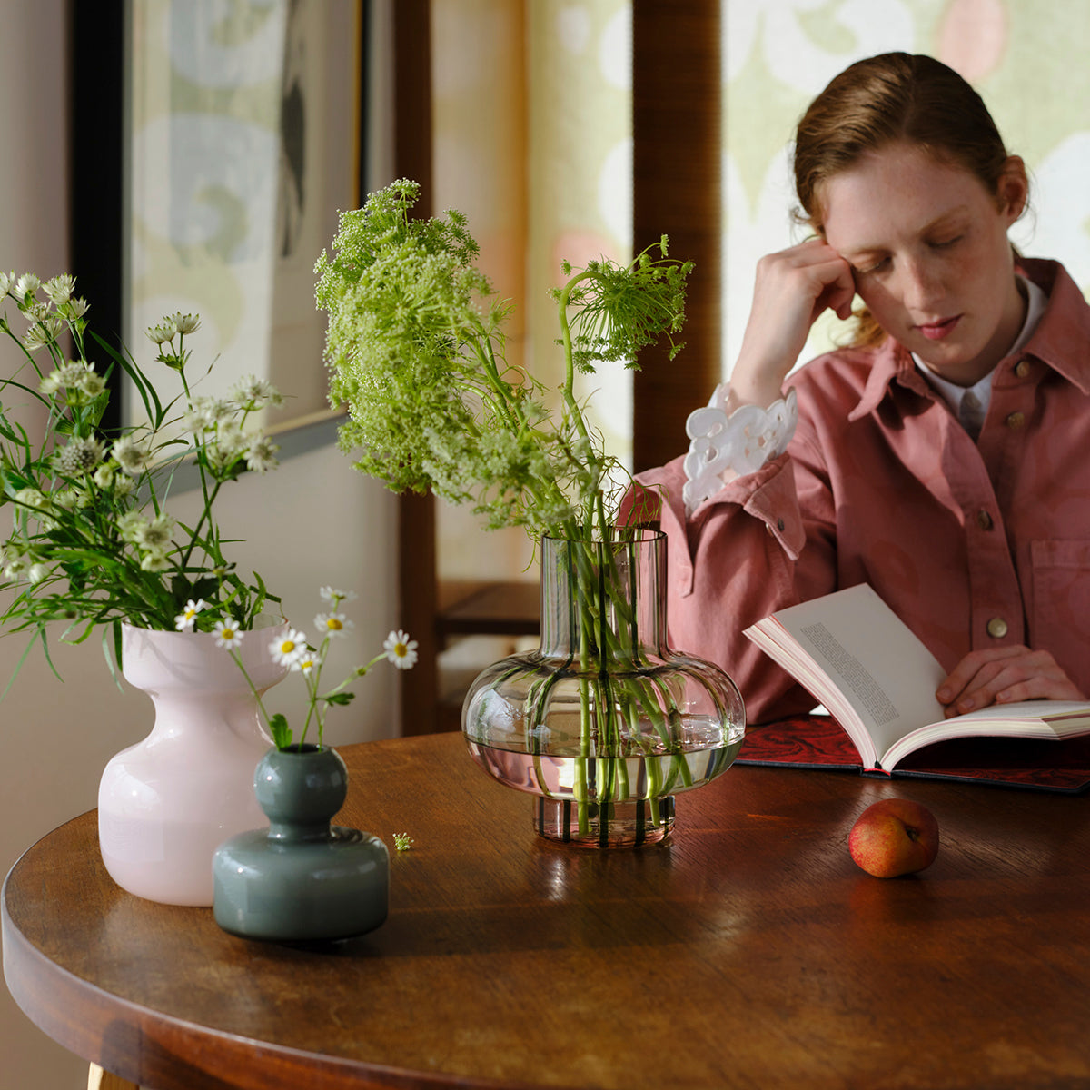 Designed by Carina Seth Andersson and crafted from mouth-blown glass, the Marimekko Umpu Glass Vase is a piece of functional art. The green stripes, which are created with a traditional filigree technique, travel down the transparent light pink glass for unique dimension. Use it to hold fresh bouquets in spring and summer, evergreen branches in winter, or dried reeds in autumn. The timeless and modern shape makes it versatile for many types of arrangements, and even beautiful empty as a standalone centerpiece.