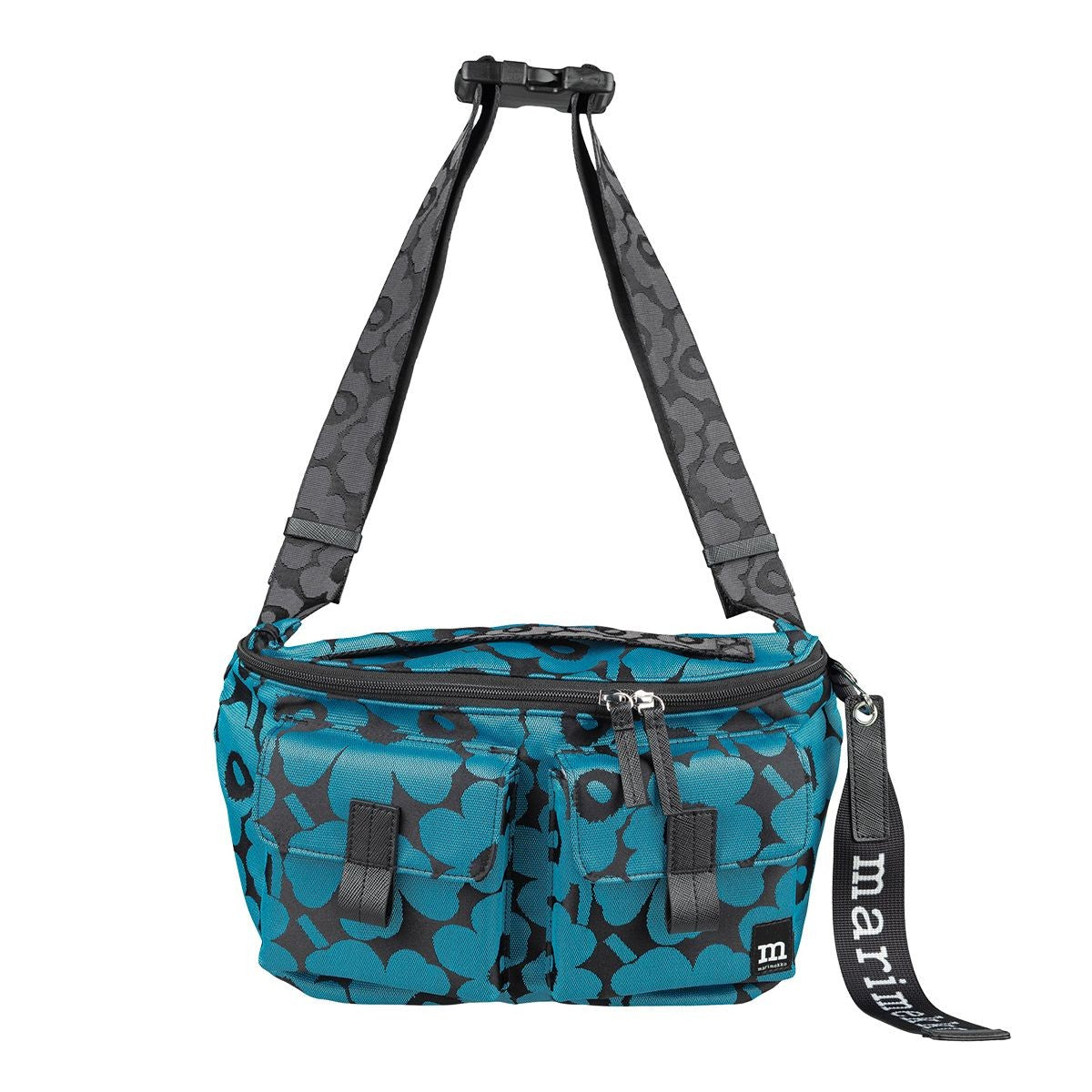 Packed with plenty of pockets and dressed in pretty poppies, the Marimekko Sling Bag will be the perfect daily companion. Maija Isola's famous Unikko (Poppy) pattern decorates the bag in striking blue and black for a pop of color atop your ensemble. The bag has a zipper closure, a handle, and an adjustable shoulder strap with a buckle, both with the jacquard knit Unikko pattern. There are two flap pockets in the front with magnetic closures, a zipper pocket on the inside, and a back outside pocket that closes with a magnetic button. It has leather details and the detachable Marimekko keychain hangs on the front.