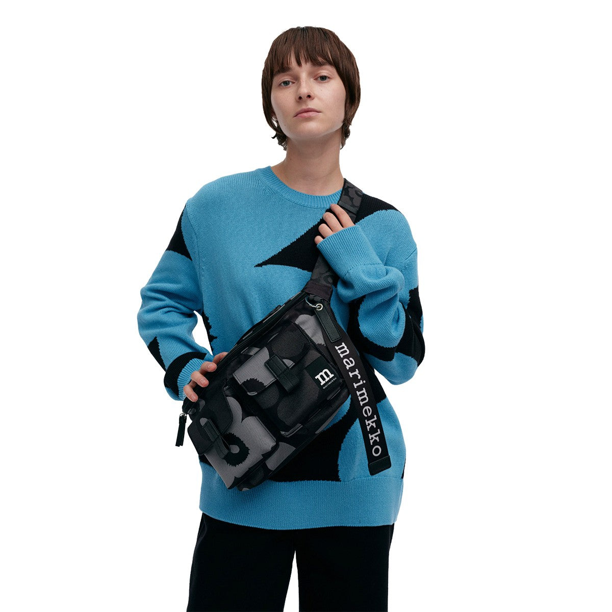 Packed with plenty of pockets and dressed in pretty poppies, the Marimekko Sling Bag will be the perfect daily companion. Maija Isola's famous Unikko (Poppy) pattern decorates the bag in alternating black and light grey to suit any ensemble. The bag has a zipper closure, a handle, and an adjustable shoulder strap with a buckle, both with the jacquard knit Unikko pattern. There are two flap pockets in the front with magnetic closures, a zipper pocket on the inside, and a back outside pocket that closes with a magnetic button. Leather details elevate the bag, while a detachable Marimekko keychain hangs on the front.