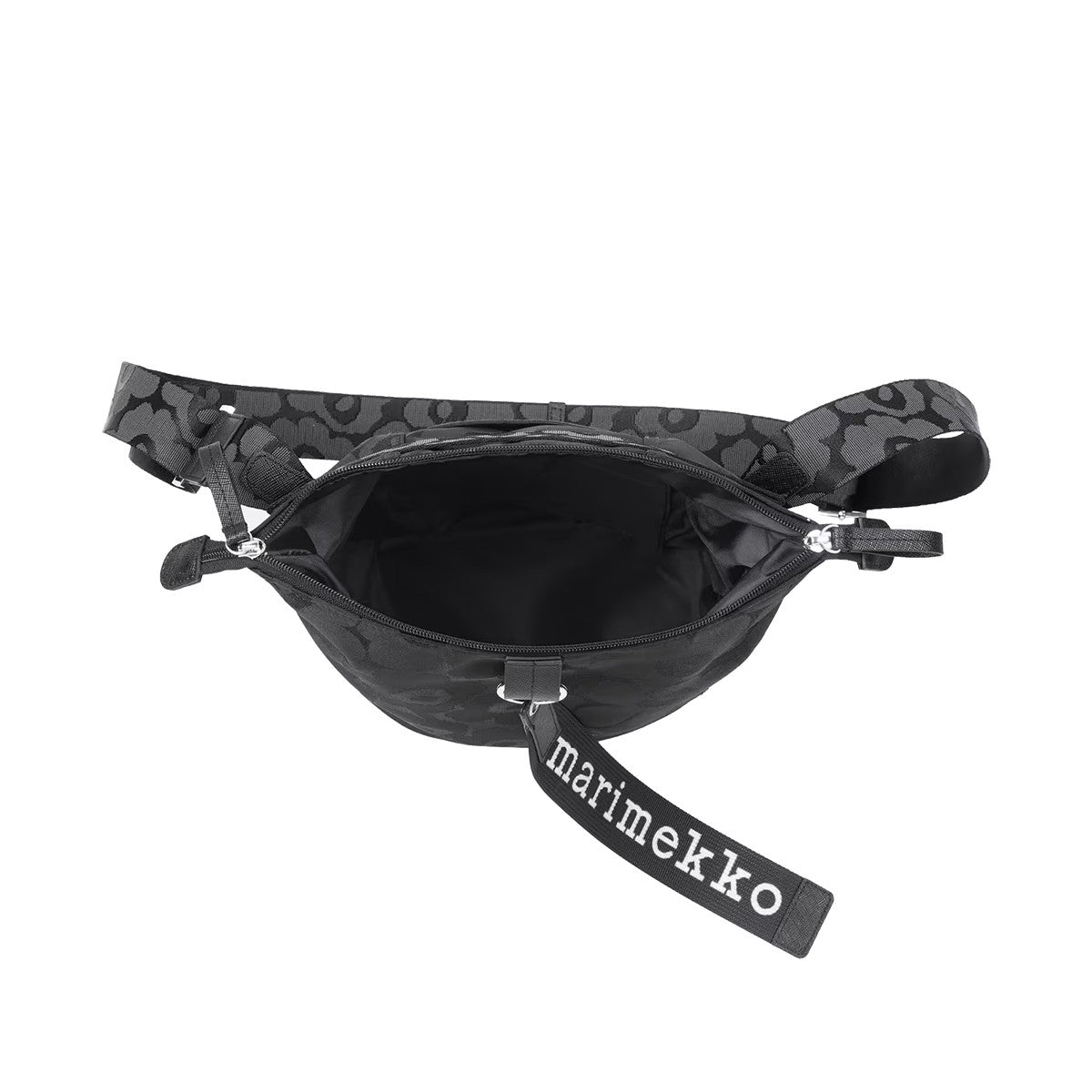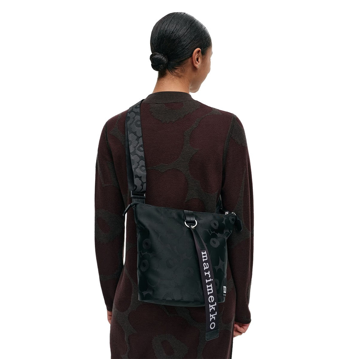 As the name suggests, this Marimekko shoulder bag easily carries all of your everyday essentials. Subtly decorated with Maija Isola's beloved Unikko (Poppy) pattern in black, the Marimekko Carry All will be just neutral enough to pair with any ensemble while remaining bold with the iconic blooms. The exterior includes sleek leather details, a handle, a detachable Marimekko keychain, and a small slip pocket on the backside. Open the zipper to find a roomy interior with an additional slip-in pocket for essentials. The adjustable strap retains the Unikko pattern, and the thick, jacquard-knit polyester material invites long-lasting use for years to come.