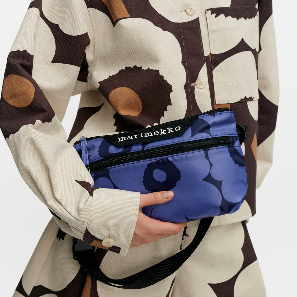 Bold, beautiful blue poppies make any outing stylish. Maija Isola's Unikko (Poppy) pattern from 1964 blooms across the Neat Crossbody bag, proving its timeless style and joyful spirit. The lightweight bag is made from recycled polyester and has a black adjustable shoulder strap that is made of recycled polyamide. The Marimekko Neat Crossbody Shoulder Bag has a zipper closure for safe keeping of your essentials, while the front features a smaller zipper pocket and the Marimekko label. There is a slip-in pocket on the inside where the whole bag can be folded away for easy storage in a purse, glovebox and more.