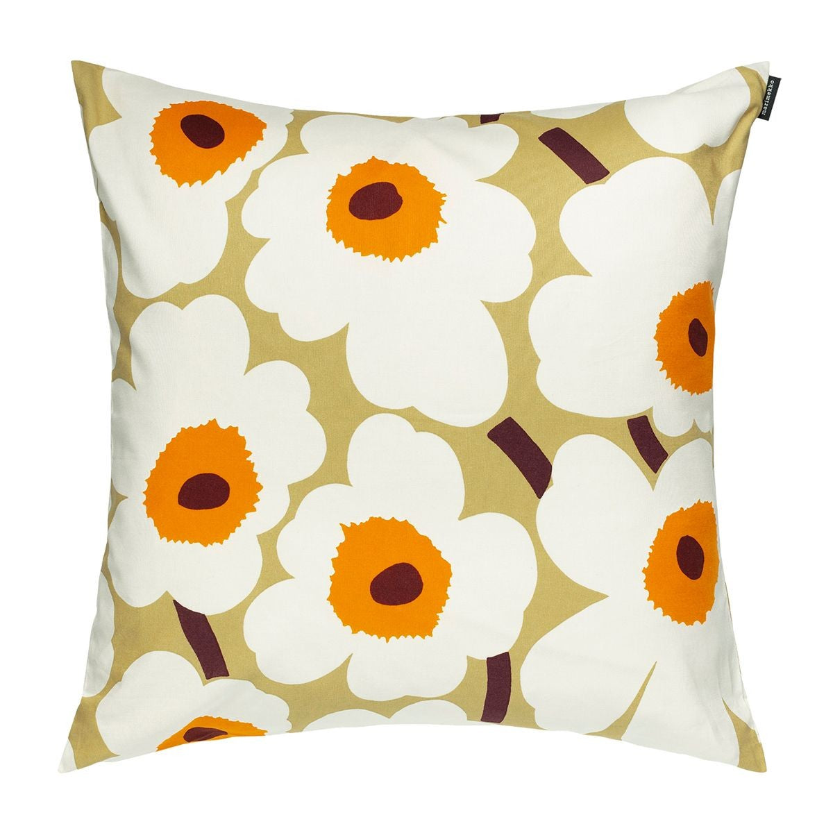 This bold and beautiful throw pillow by Marimekko will make a statement in any interior thanks to its cozy colors and timeless design. Maija Isola's famous poppies from 1964 sit atop a warm caramel backdrop and are refreshed in a cream, vibrant orange and dark burgundy colorway. The machine-washable Marimekko Unikko Throw Pillow is made from a durable 100% cotton material, and it includes a discreet side zipper for easy removal of the cushion insert. Decorate a sofa, bed, accent chair or bench with Unikko charm.