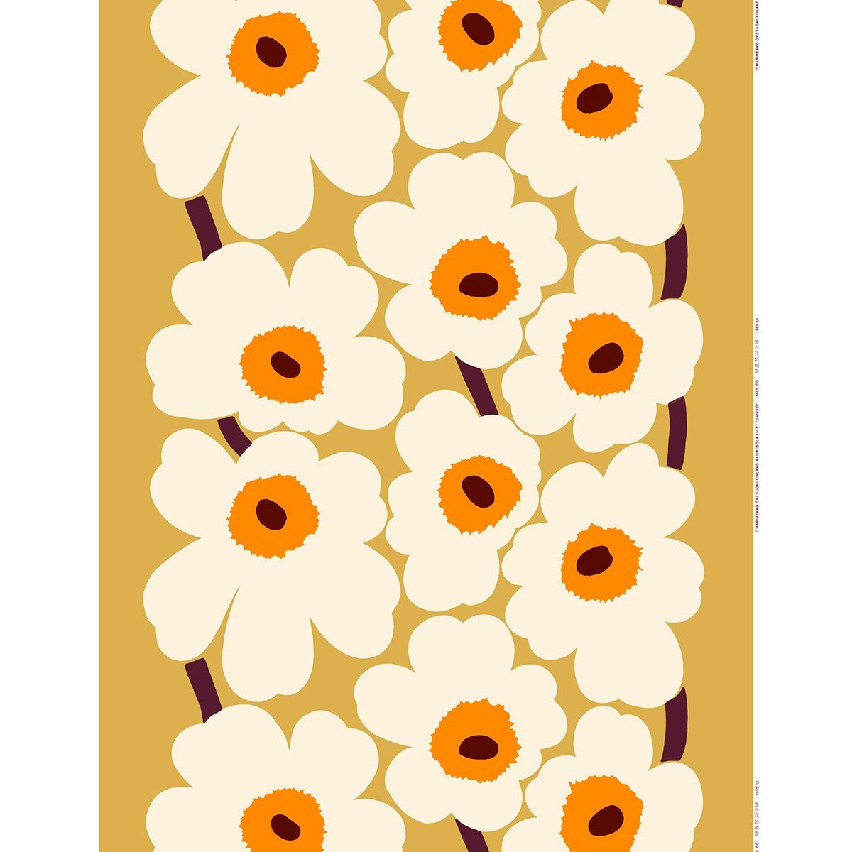 Since 1964, Marimekko's Unikko (Poppy) pattern by Maija Isola has brought blooming joy to interiors and clothing. The iconic poppies are as bold and beautiful as ever in a refreshed caramel, off white, vibrant orange and dark burgundy colorway. Made in Finland from 100% medium weight cotton, bring these large-scale blooms into a room or wardrobe through a wall hanging, curtain, table linen, dress, and more.