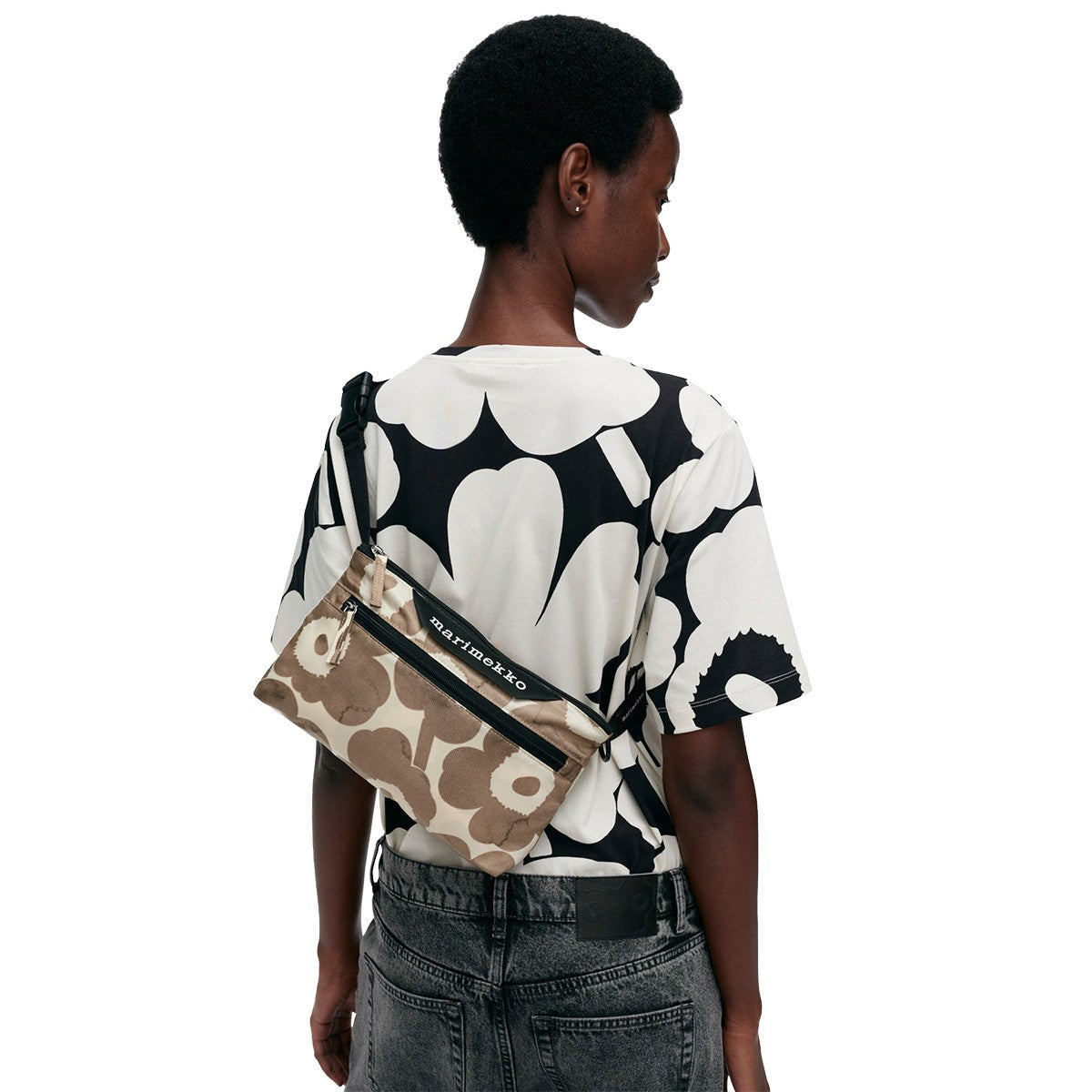 Maija Isola's famous florals are bold and beautiful in a cream and almost transparent charcoal colorway atop the Marimekko Unikko Small Neat Crossbody Shoulder Bag. Neutral enough for any ensemble when on-the-go, the bag is made of lightweight, recycled polyester and has an adjustable shoulder strap that is made of recycled polyamide. The Neat Crossbody has a zipper closure for safe keeping of your essentials, while the front features a smaller zipper pocket and the Marimekko label. There is a slip-in pocket on the inside where the whole bag can be folded away for easy storage in a purse, glovebox and more.