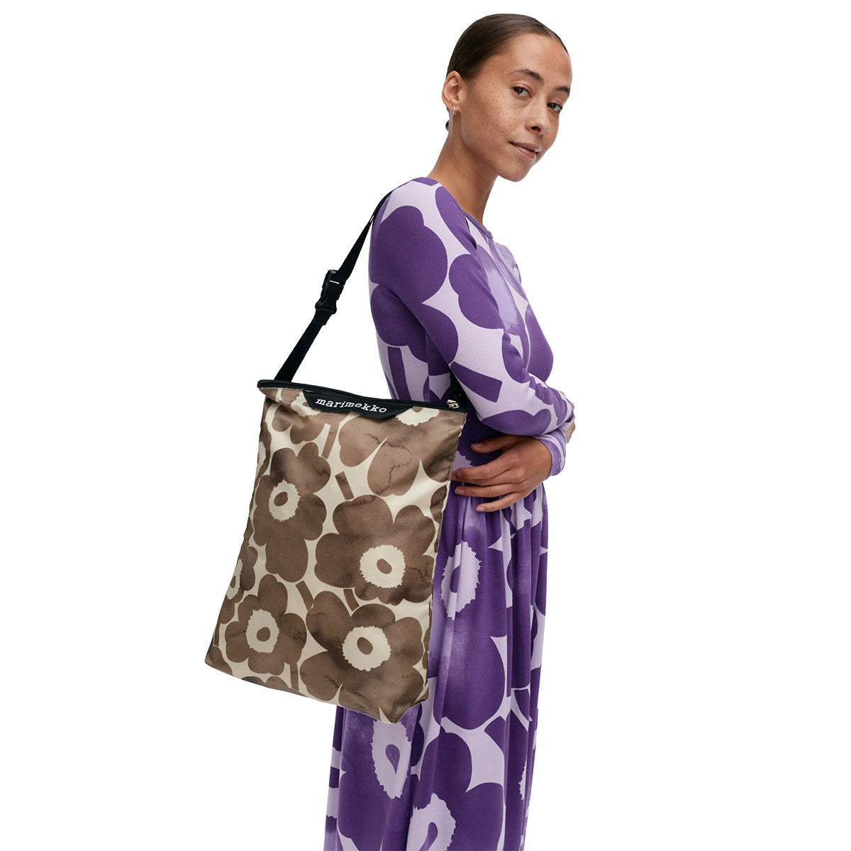 Maija Isola's famous florals are bold and beautiful in an almost transparent charcoal and cream colorway atop the Marimekko Medium Neat Crossbody Shoulder Bag. Neutral enough for any ensemble, the bag is made of lightweight recycled polyester, and it has an adjustable shoulder strap that is made of recycled polyamide. The bag has a zipper closure and Marimekko label on the exterior, while the inside includes a slip-in pocket where the whole bag can be folded away for easy storage in a purse, glovebox and more. The medium size has a deep and roomy interior that will be ideal for smaller electronics, books, everyday essentials and more.