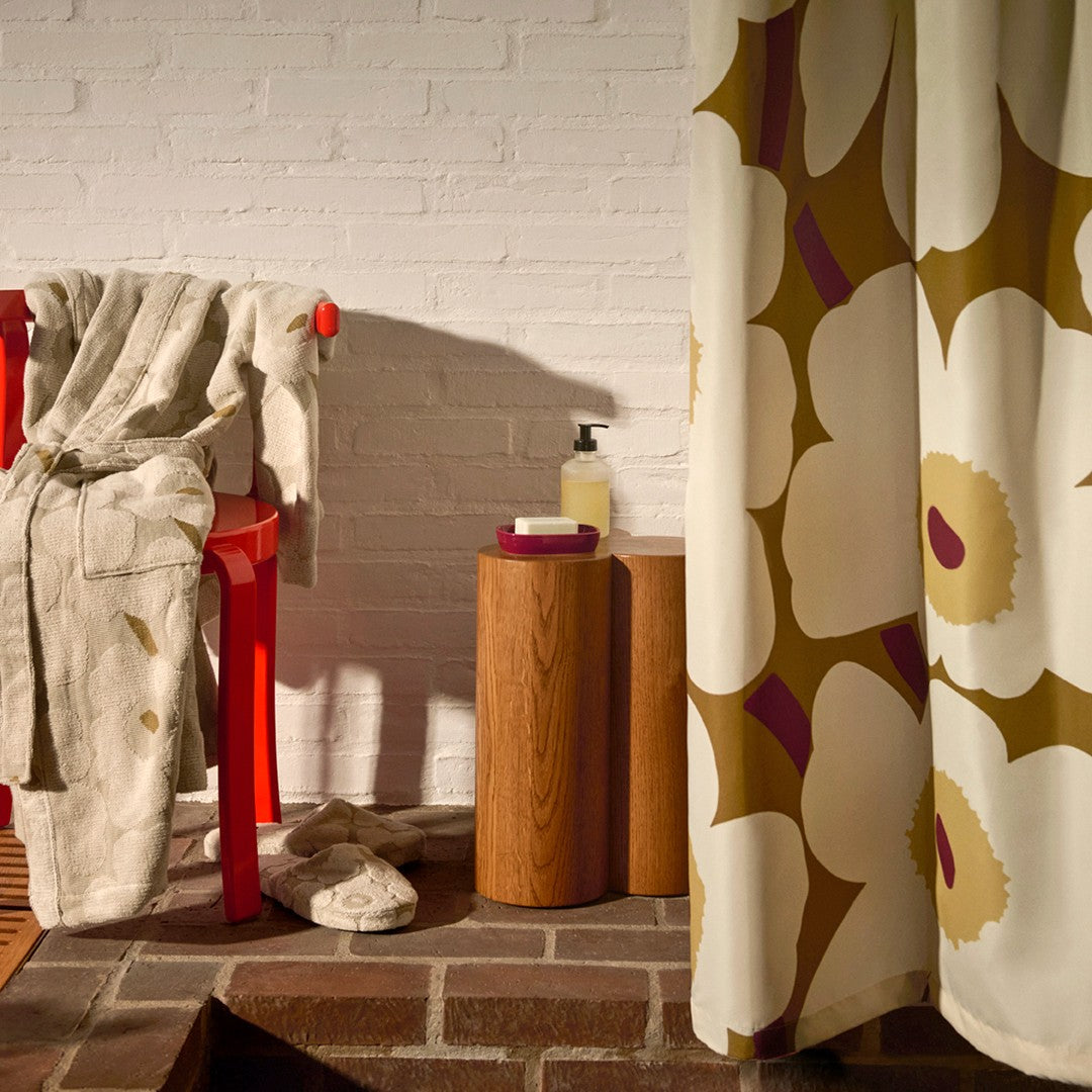 Keep warm and stylish after the shower, bath, sauna or spa with Marimekko's cozy collection of bathrobes. Maija Isola's beloved Unikko (Poppy) pattern blooms across this bathrobe in an earthy olive green and cream colorway, while the alternating-colored threads give the it a lively and textured appearance. Included are long sleeves, two front pockets, and the robe ties around the waist with a sewn-in belt for the perfect fit. When not in use, hang it in the bath with its attached loop for an effortless display of these joyful blooms.