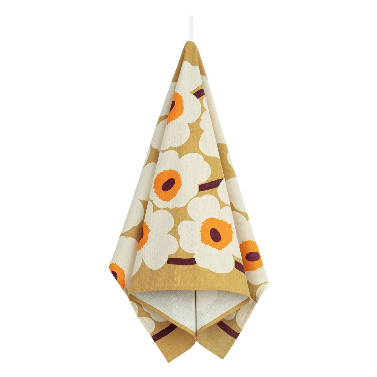 Maija Isola's beloved Unikko (Poppy) pattern from 1964, which has become a global icon of joy and creativity, blooms across this Marimekko tea towel. Decorated atop a warm caramel backdrop, the off-white petals and orange details are uniquely contrasted by burgundy centers and stems. The Marimekko Unikko Tea Towel is made from a cotton-linen blend, a lightweight yet durable material for all jobs in the kitchen. When not in use for drying hands, drying dishes, covering warm pastries, and more, display these beautiful blooms in the kitchen with the attached hanging loop.