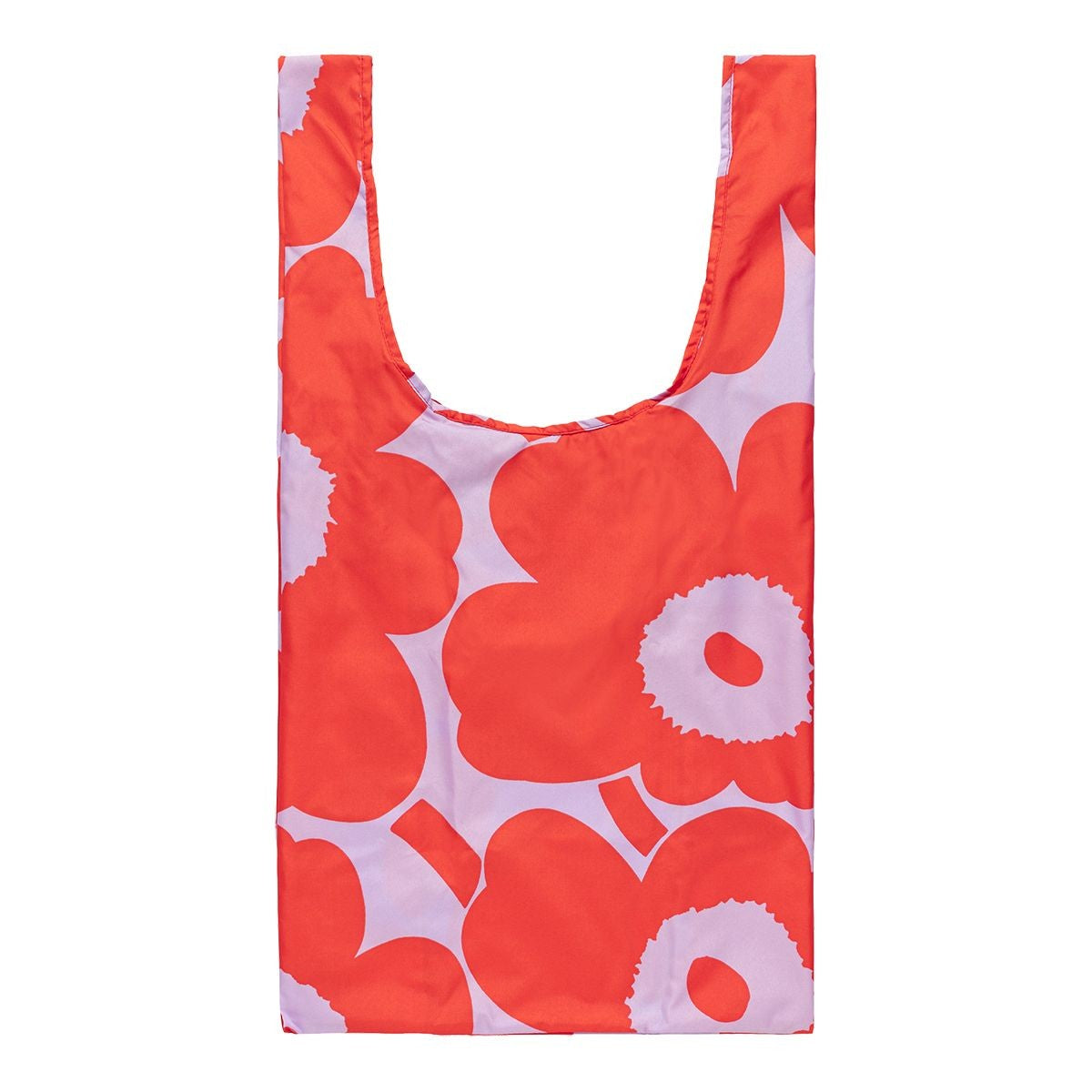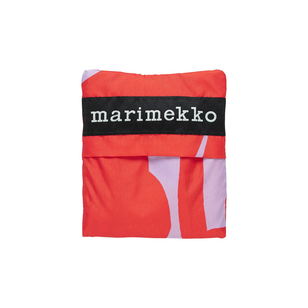The Marimekko Smartbag is a stylish and sensible option for grocery shopping and running errands. It is decorated with Maija Isola's beloved Unikko (Poppy) pattern in a energetic red and lilac purple colorway. The tote bag is made of 100% recycled polyester and folds into its attached pouch for easy storage and travel. Keep the smartbag in your car, purse, and on hand for an eco-friendly way to store, carry, and gift large items!