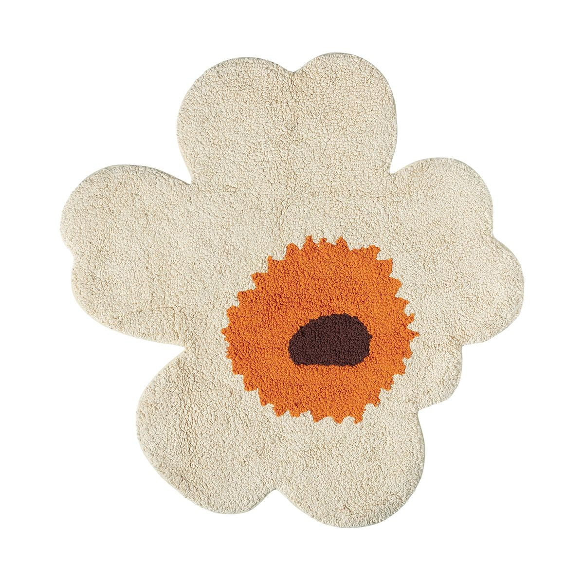 Let the bath bloom with the Marimekko Unikko Bath Mat. Hand-cut in the shape of Maija Isola's famous poppy flower, this Marimekko rug will stun with its large-scale floral and joyful design. The cozy cream, orange and brown colorway is just neutral enough for any bath interior, while the bloom remains bold and eye-catching. Made from 100% organic cotton terry, the machine-washable Marimekko bath mat will feel comfortable and pleasant to walk upon with its tufted surface, plush texture and non-slip backing.