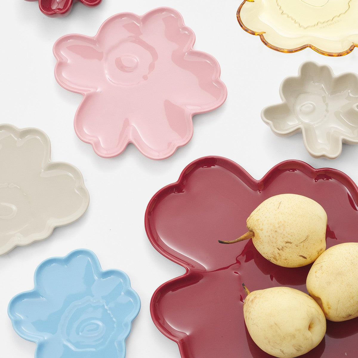 These poppy-shaped plates will be a wonderful backdrop to whatever goodies you put atop. Cut into the shape of Maija Isola's beloved Unikko (poppy) flower, the plates have a shiny, glazed finish in stunning sky blue and sand hues. The petite plates will be ideal for small snacks, dips, assorted nuts and hors d'oeuvres , or, use them as decorative dishes for jewelry and other small treasures; the possibilities are endless! The Marimekko Unikko Shape Light Blue / Sand Snack Plates are made from durable stoneware and are packaged in a Marimekko box for easy gifting.