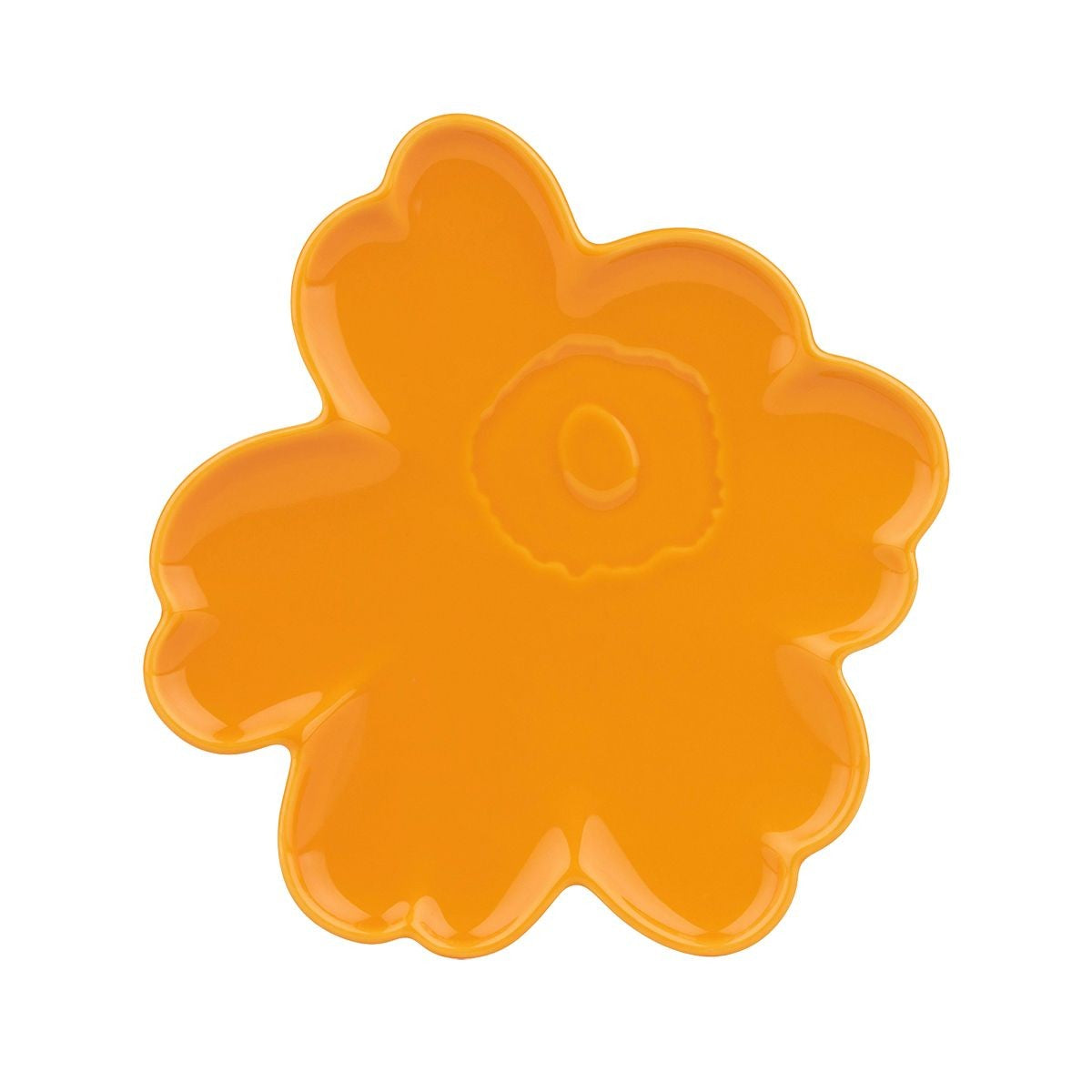 Representing an icon of joy and creativity, this Marimekko salad plate is cut out into the shape of a single poppy from Maija Isola's beloved Unikko pattern. In a vibrant saffron yellow hue, the shiny, glazed plate features round edges to replicate the poppy's petals and engraved accents atop to show details of its center. Use the Marimekko Unikko Shape Saffron Yellow Salad Plate for appetizers and treats, or, as a decorative dish for jewelry, perfume and other small treasures!
