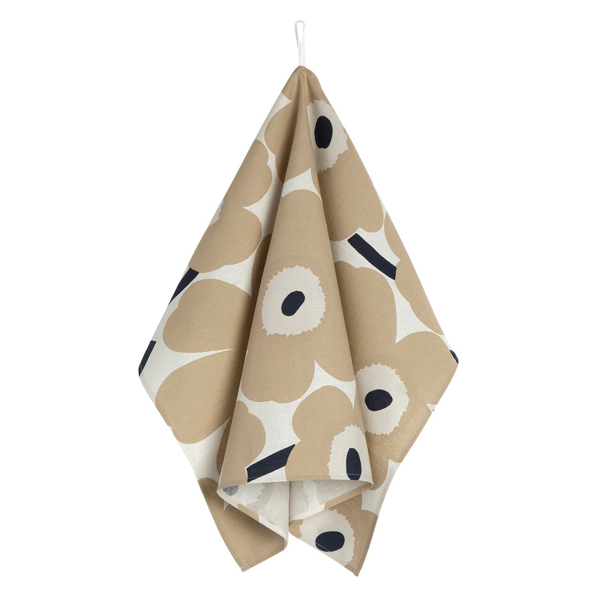 Maija Isola's 1964 poppies called "Unikko" will bring timeless style to your kitchen. In warm and neutral shades of beige and navy on an ivory backdrop, it's the perfect print for any season. The two cotton-linen blend tea towels are soft yet durable, making them perfect for drying dishes and hands, wiping down surfaces, or covering warm pastries. When not in use, display them by the attached loops.