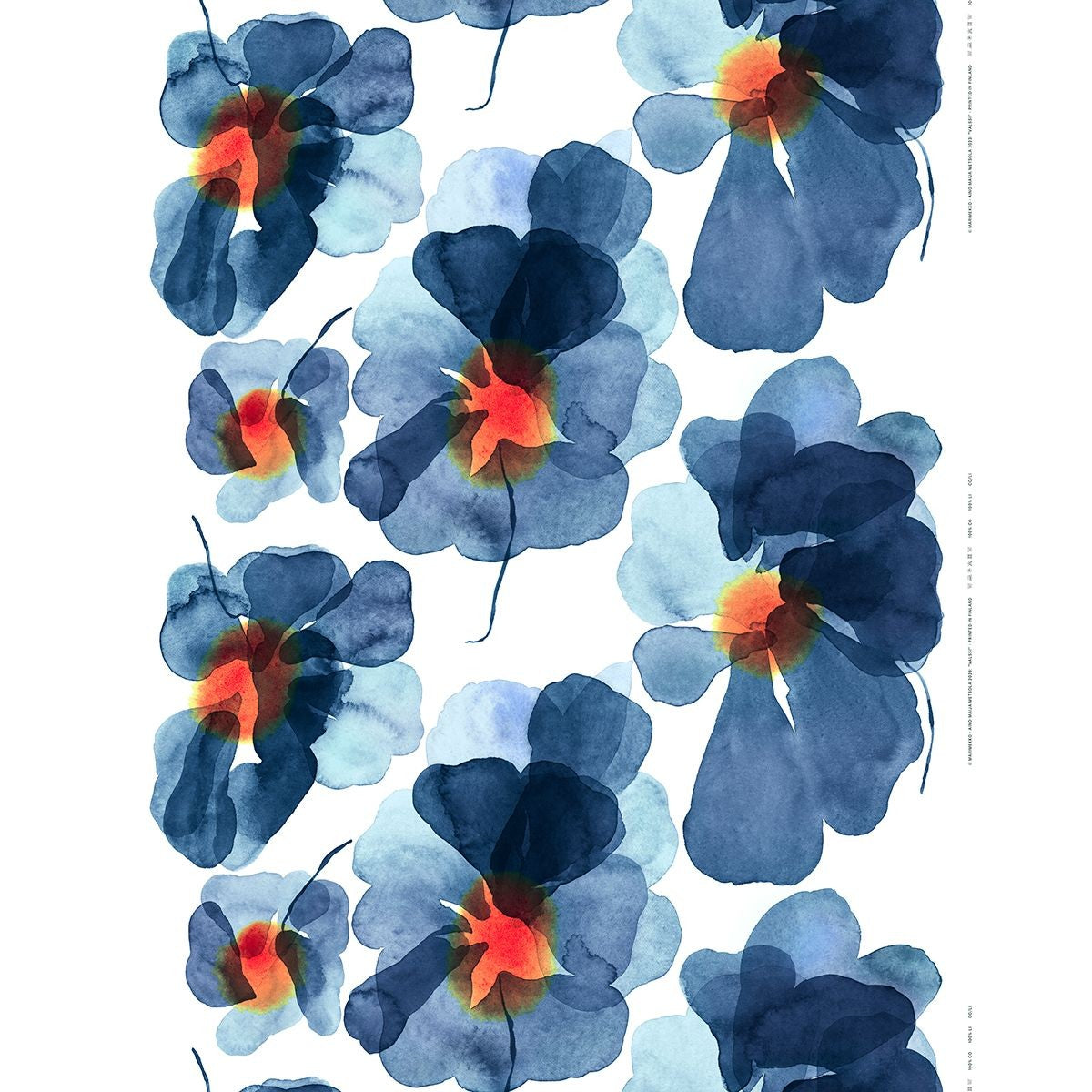 Aino-Maija Metsola's delicate Valssi (Waltz) print draws inspiration from flowers that dance in the breeze during summer evenings. The watercolor brush strokes of the petals switch between transparent light blue and solid navy to depict a sense of movement, while bright orange centers add unique contrast. Atop this Marimekko fabric, let this large-scale pattern and calming colors decorate your interior through curtains, a tablecloth, wall hangings, and more. The Marimekko Valssi fabric is made in Finland from medium weight 100% cotton.