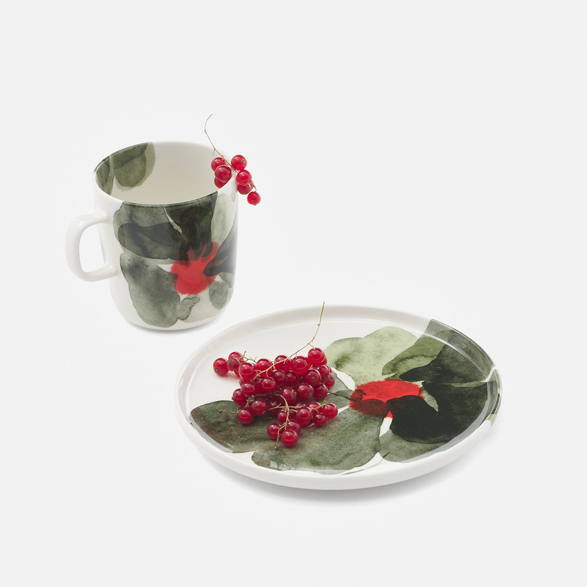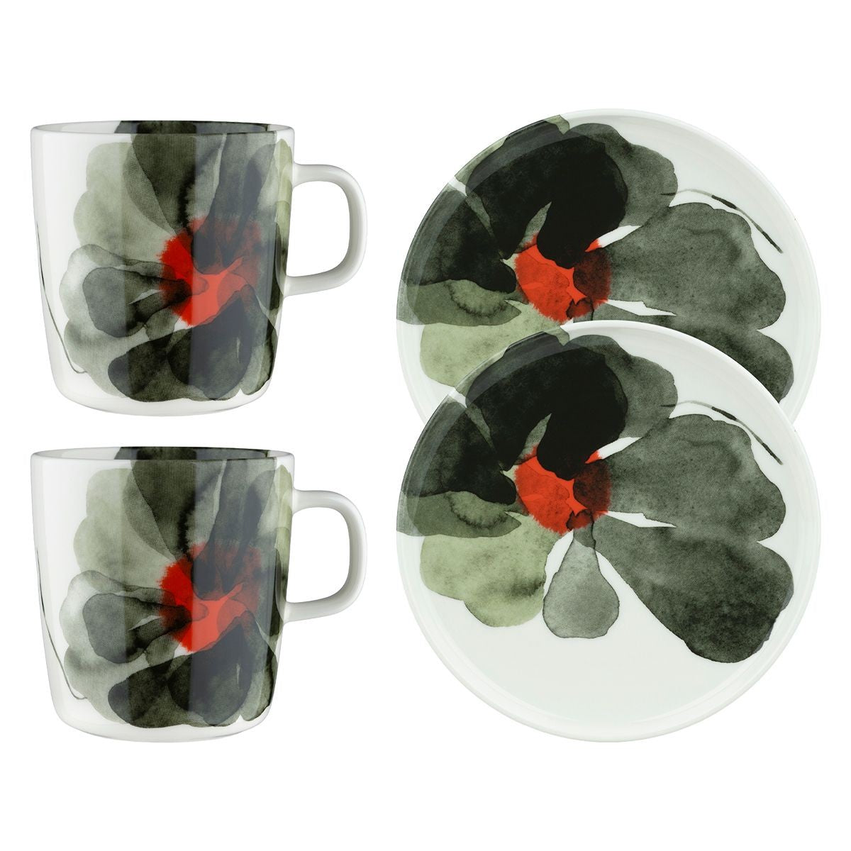 Aino-Maija Metsola's delicate Valssi (Waltz) print draws inspiration from flowers that dance in the breeze during summer evenings. The watercolor brush strokes of the petals switch between transparent sage and forest green to depict a sense of movement, while eye-catching red centers add unique contrast. Decorating this cohesive 4-piece breakfast set by Marimekko, the soothing design decorates two large mugs and two salad plates to match. The Marimekko Valssi Green 4pc Breakfast Set is made of dishwasher-safe white stoneware for everyday indulgence and is packaged in a Marimekko gift box.