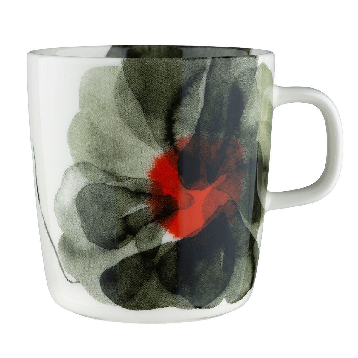 Aino-Maija Metsola's delicate Valssi (Waltz) print draws inspiration from flowers that dance in the breeze during summer evenings. The watercolor brush strokes of the petals switch between transparent sage and forest green to depict a sense of movement, while eye-catching red centers add unique contrast. Wrapped around this Marimekko mug, sip 13.5 ounces of coffee, tea and other beverages from tranquil design and cozy colors. The Marimekko Valssi Green Large Mug is crafted from durable white stoneware, which is microwave, oven, freezer and dishwasher safe for long-lasting use and everyday indulgence.