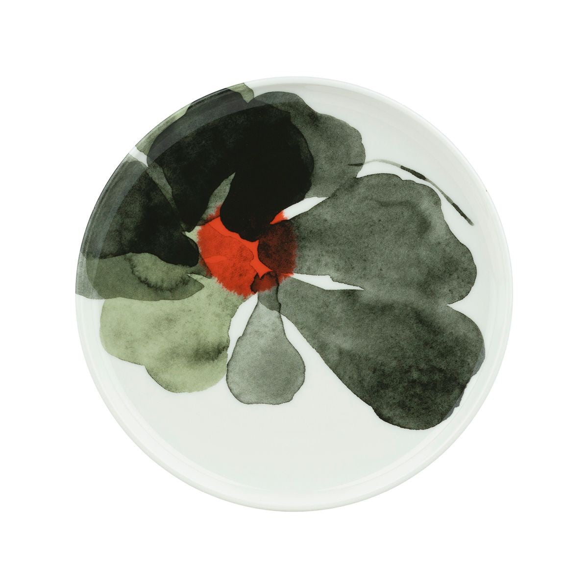 Aino-Maija Metsola's delicate Valssi (Waltz) print draws inspiration from flowers that dance in the breeze during summer evenings. The watercolor brush strokes of the petals switch between transparent sage and forest green to depict a sense of movement, while eye-catching red centers add unique contrast. Atop this Marimekko salad plate, enjoy breakfast and other treats from soothing colors and cozy design. The Marimekko Valssi Green Salad Plate is made from durable white stoneware, which is microwave, oven, freezer and dishwasher safe.