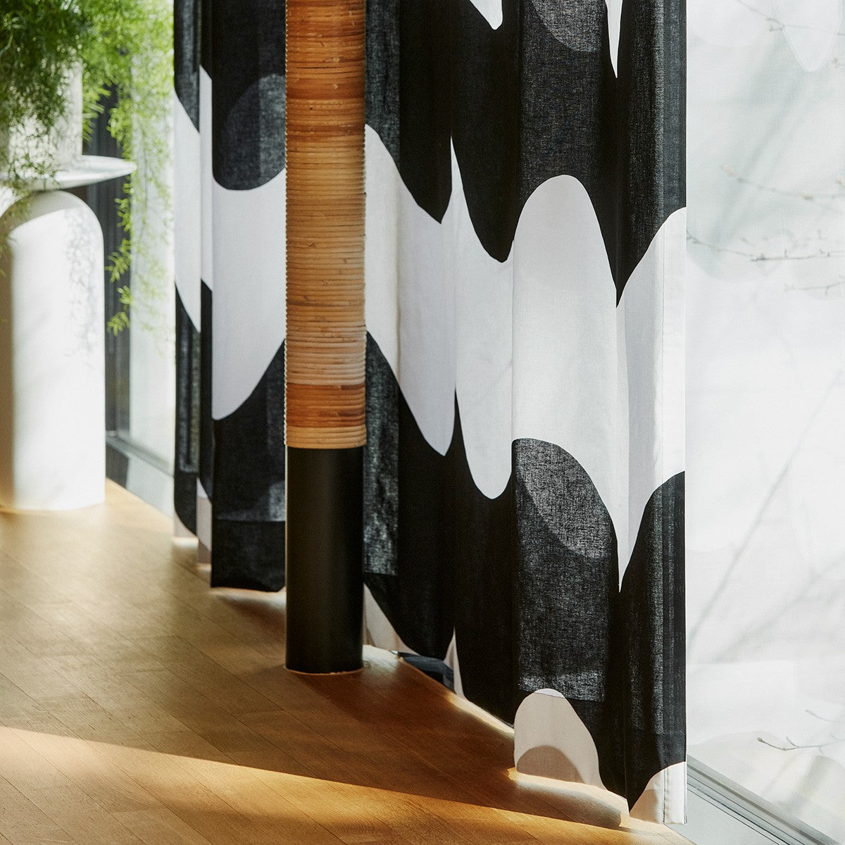 While Maija Isola worked in her office, she felt inspired by the pattern of light through her blinds and the familiar caw of seagulls. She grabbed a pair of scissors and crafted the Lokki (seagull) waves. Now a playful icon, particularly modern in black and white, Marimekko Lokki Fabric can be used for anything from a playroom fort to custom drapes. Made from 100% cotton, the Lokki fabric is machine washable and soft to the touch.