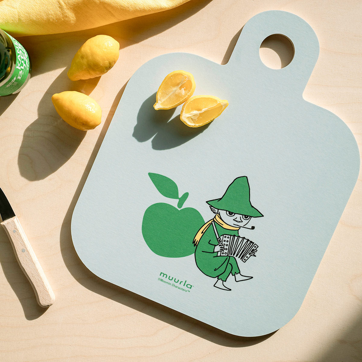This reversible board by Muurla is an adorable way to prep and present your dishes. Optimal hardness of the Finnish birch wood allows you to chop up fresh food and serve your spread on the same surface. Combining two designs in one item, the playful Moomin Joyful Apples design features large apples and familiar friends from Moominvalley to bring instant joy to any setting. The handle makes it easy to carry around the kitchen, and the hole also allows it to be hung on display when not in use. Handmade in Finland, the matte coated surface makes the tray both food and dishwasher safe.