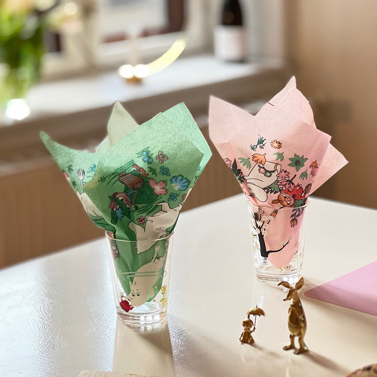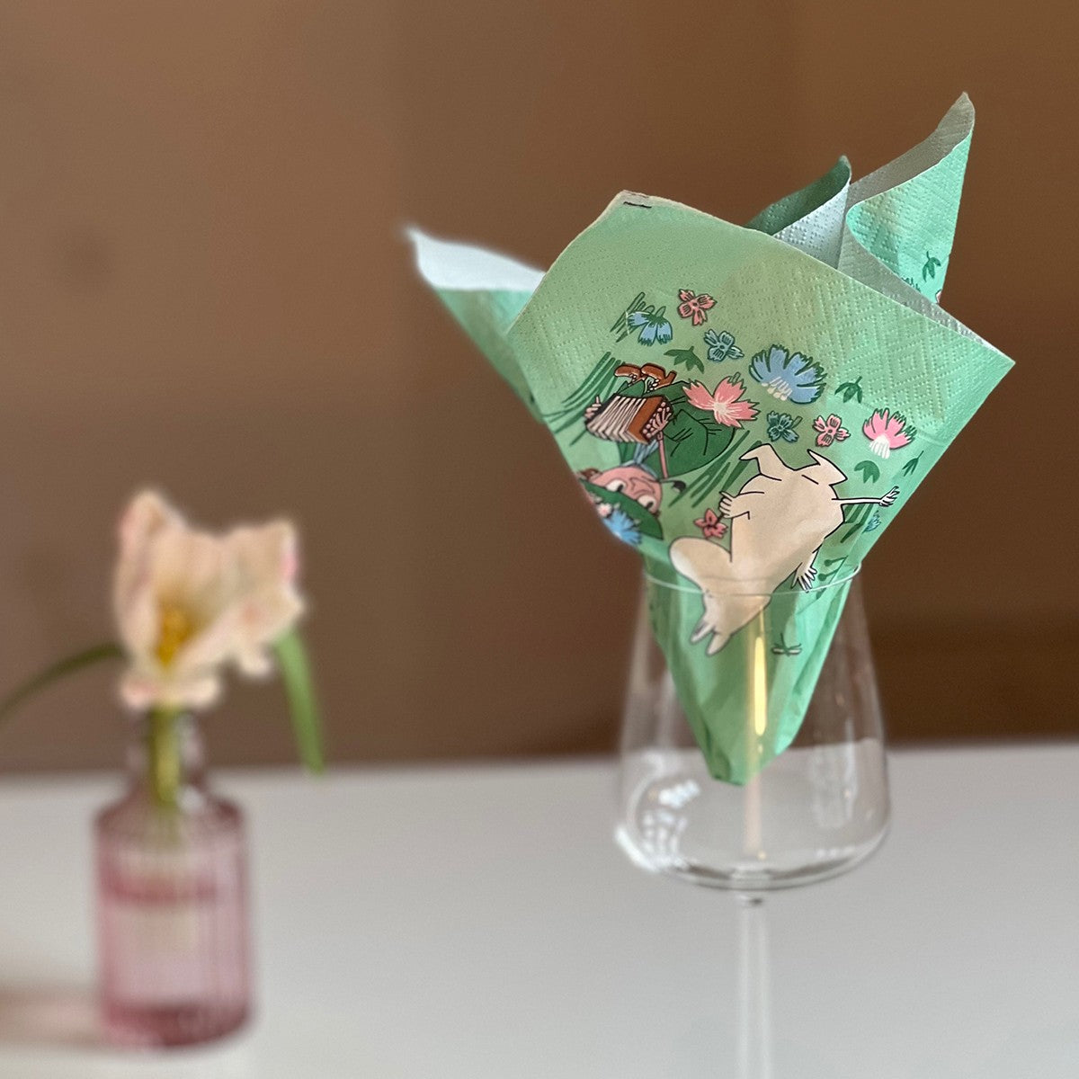 Bring Moomin magic to any meal with the Moomintroll & Snufkin Lunch Napkins by Opto Design. Based on original drawings by Tove Jansson, the napkins feature these two friends reuniting after Snufkin's winter travels while spring blooms around them in Moominvalley. This pack of 20 paper napkins is perfect to have on hand for parties and gatherings, and is a playful and eco-friendly way to enjoy the convenience of disposable napkins.