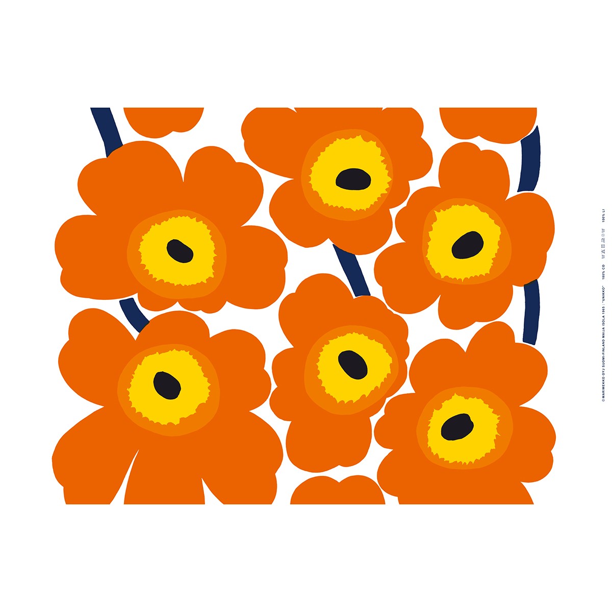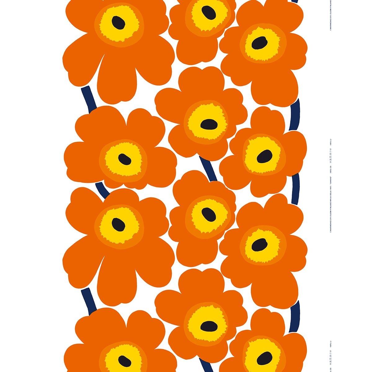 Since 1964, Marimekko's Unikko (Poppy) pattern by Maija Isola has brought blooming joy to interiors and clothing. The iconic poppies are as bold as ever in vibrant orange and yellow, contrasted by dark blue centers and stems. Made in Finland from 100% cotton, bring these large-scale blooms into a room or wardrobe through a wall hanging, curtain, table linen, dress, and more.