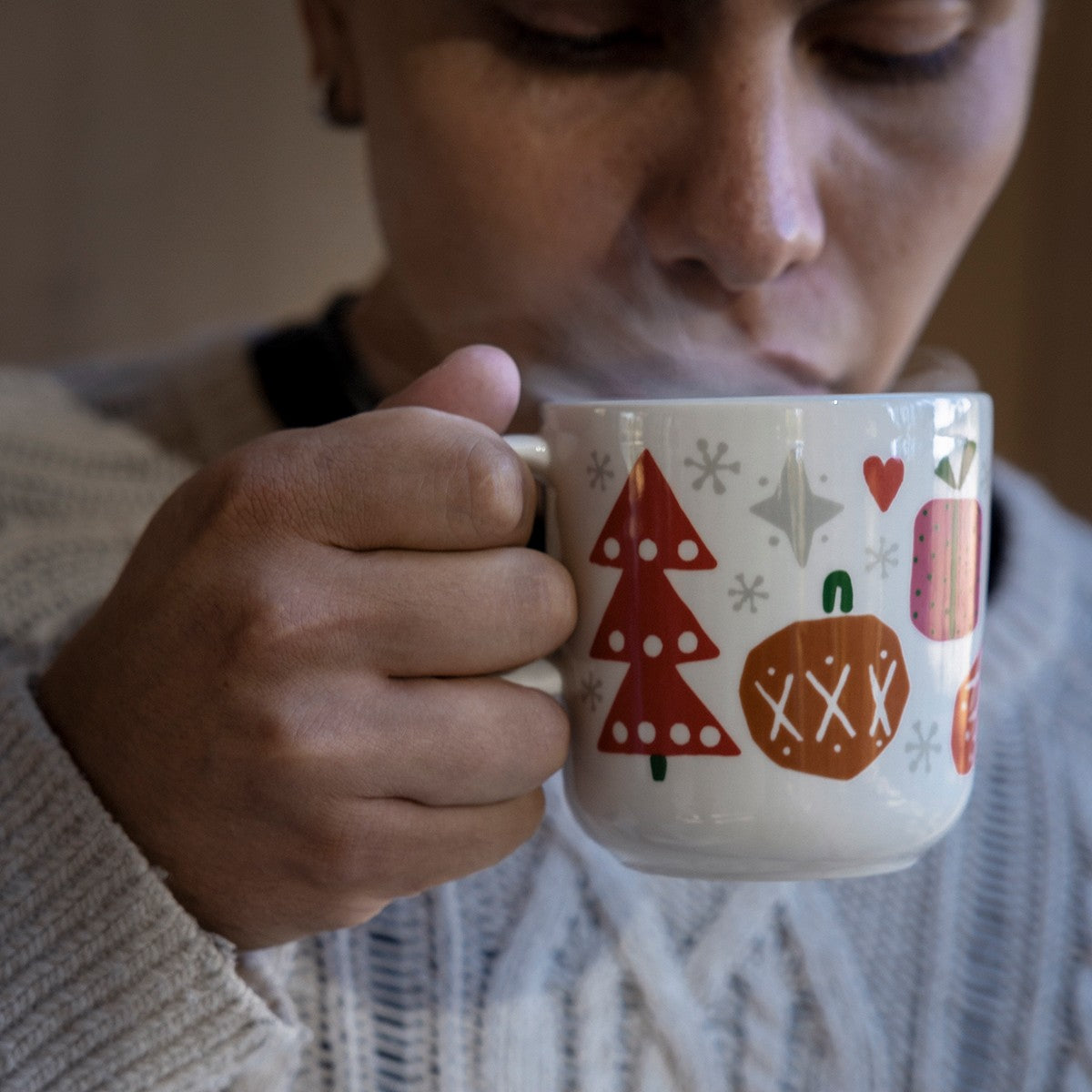 The Pentik Aatto Mug, which fittingly translates to "Eve" in Finnish, perfectly captures the anticipation of Christmas day with festive stockings, presents, trees, reindeer and more. Painted with red, green, grey and pink hues, enjoy all the tasty beverages this season brings with this jolly mug. The Pentik Aatto Mug is made in Finland from ceramic, and is microwave, oven, freezer, and dishwasher safe.