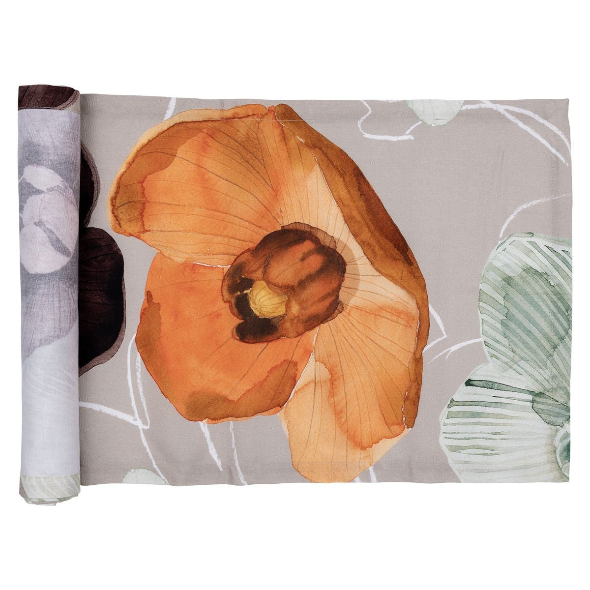 Dress the table in dreamy florals and beautiful colors with this piece of textile art. As a tribute to Anu Pentik and her life's work, Lasse Kovanen designed the Haave (Dream) series. Atop this Pentik table runner, Anu's iconic ceramic flower sculptures have been transformed into print design with northern nature-inspired colors. Vibrant autumn orange, winter white, spring burgundy and summer green are meant to represent the distinctive seasons in Finland. The Pentik Haave Table Runner is made from 100% cotton, which is soft yet durable for long-lasting use.