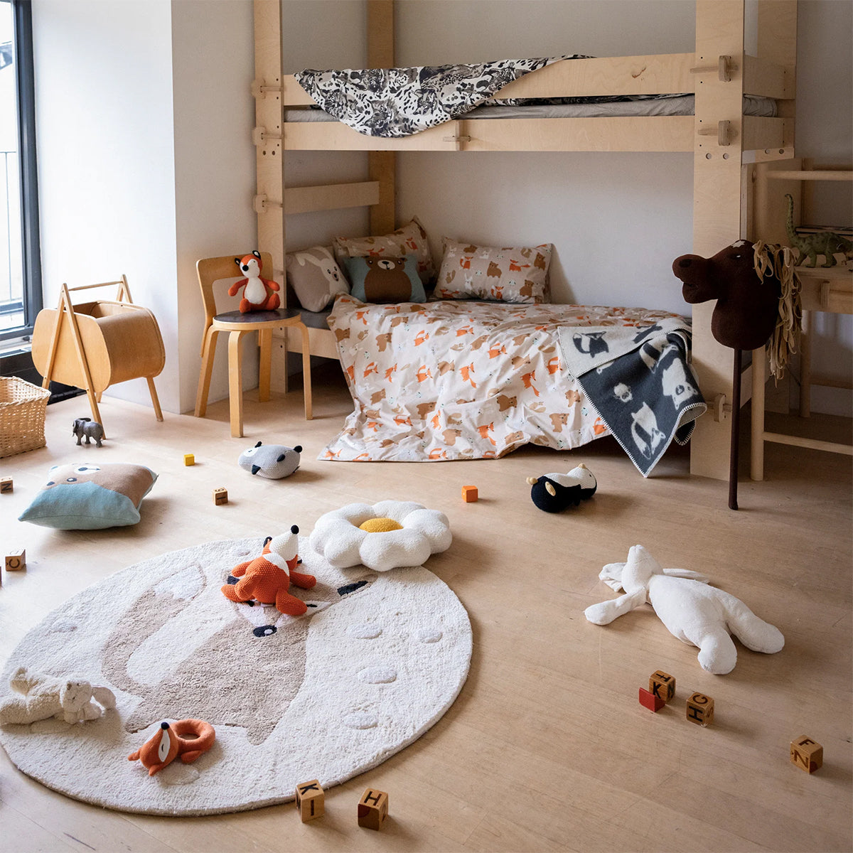 The Pentik Halipupu Children's Throw Pillow brings sweet dreams to nap time. "Halipupu" fittingly translates to "Hug Bunny," and an adorable white bunny decorates this cozy light brown pillow. The 100% cotton cover is soft on skin, while the neutral tones will seamlessly fit in any playroom or nursery. It includes a discreet side zipper on the bottom to easily remove the cushion insert for machine washing.