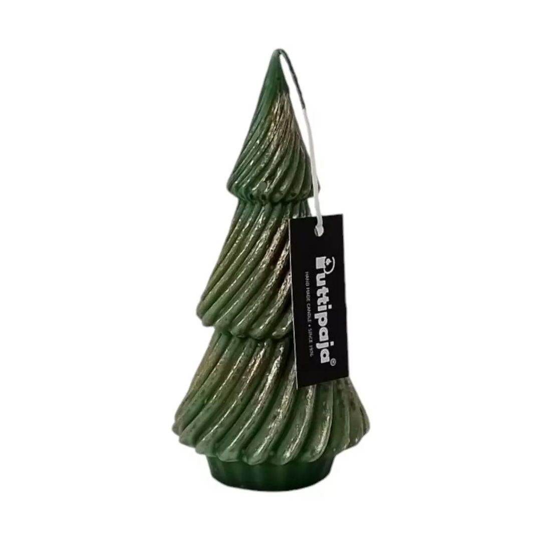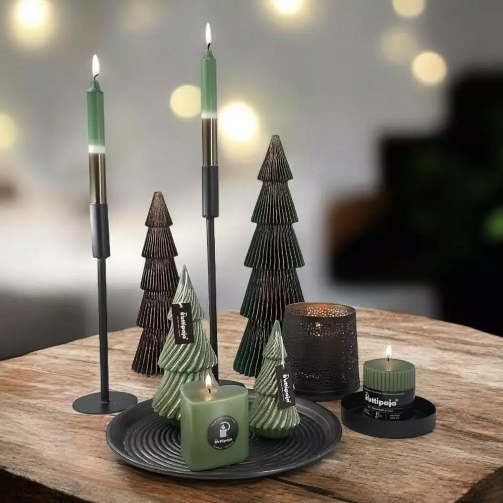 This fir tree-shaped candle in glittery green is sure to deck the halls with holiday charm. Use a few to create ambiance at a holiday table, line along a mantle or dresser for a decorative glow, or create a cozy atmosphere on dark winter evenings. The Puttipaja Metallic Green Tree Candle will be perfect for your own holiday decor or as a festive gift for a loved one. Since 1976, all of Puttipaja's candles have been made by hand at their candle factory in Finland.
