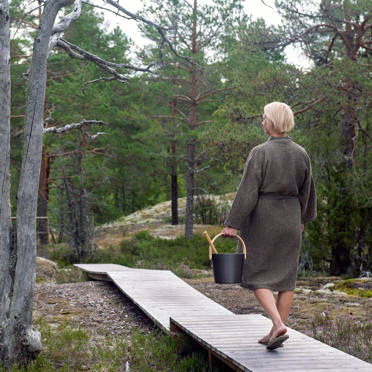 This cozy Rento Kenno bathrobe has stylish chambray borders and a waffle knit texture. The cotton material is durable, but also lightweight and breathable for year-round use after the sauna, bath, shower or spa. Included are airy sleeves, a belt for the perfect fit and an attached hanging loop to dry when not in use.