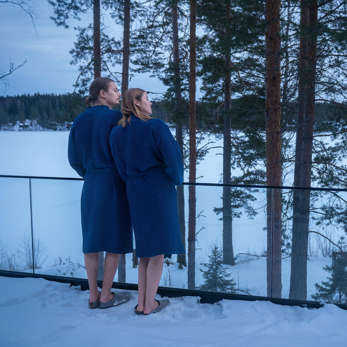 This cozy Rento Kenno blue bathrobe has stylish chambray borders and a waffle knit texture. The cotton blend is durable, but also lightweight and breathable for year-round use after the sauna, bath, shower or spa. Included are airy sleeves, a belt for the perfect fit and an attached hanging loop to dry when not in use.