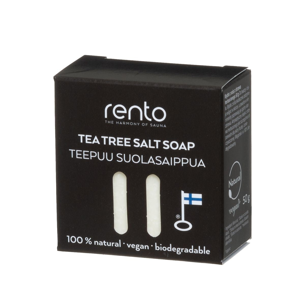 Handmade in Finland, the Rento Tea Tree Salt Soap gently washes the face and body with 100% natural materials. Salt soap containing tea tree oil is especially suitable for oily skin, and its antibacterial properties help neutralize impurities. The minerals in salt soap effectively bind moisture into the skin and improves the overall skin well-being. With no added fragrances, this all-natural vegan soap will feel pleasant on the body and leave you feeling fresh after the sauna, shower or bath.