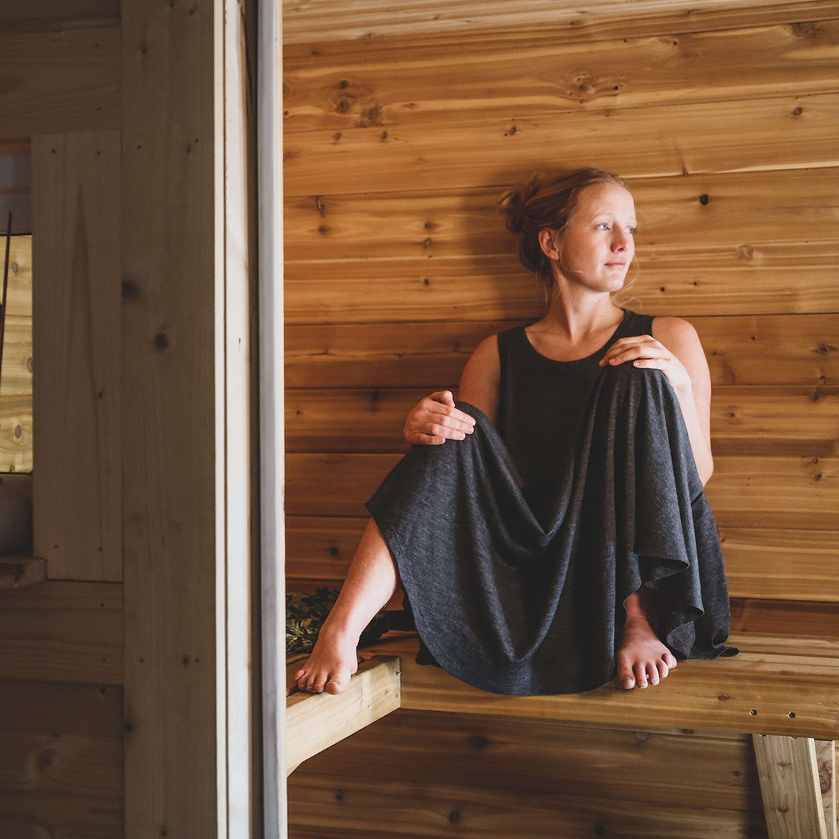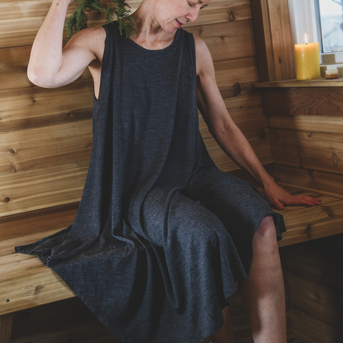 The Saunamekko Sauna Dress offers a luxurious and comfortable alternative to a traditional swimsuit. Designed for use in and out of the sauna, the Sauna Dress effortlessly translates from the sauna to casual, everyday wear. It is made from ethically-sourced, 100% New Zealand merino wool, which is naturally breathable, odor resistant, moisture wicking, and temperature regulating. The lightweight and loose-fitting style is non-restrictive to allow your body to move freely in the sauna and beyond. Elevate your sauna experience and reach maximum relaxation with the Saunamekko Sauna Dress.