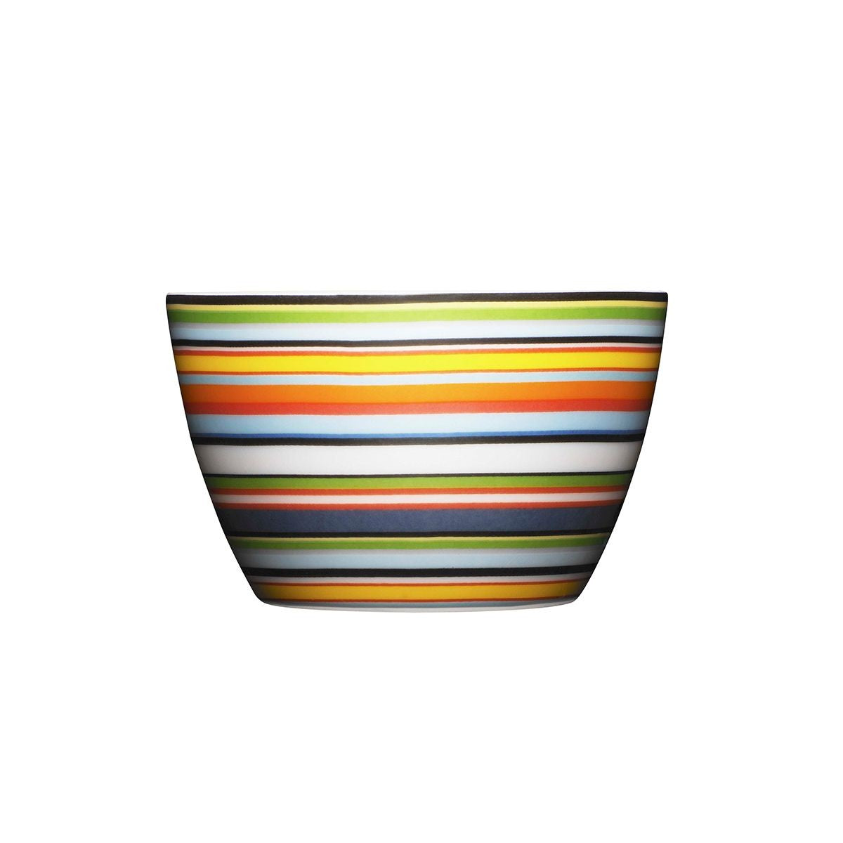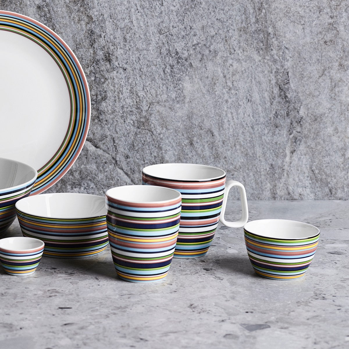 The iittala Origo is a colorful and innovative dinnerware created by designer Alfredo Haberli in 1999. Acclaimed internationally, this award-winning design is comprised of brightly-striped ceramic bowls, mugs, and plates that are designed for practical, everyday use; the saucers and plates act as both lids and chargers for the Origo mugs and bowls, creating a stackable and interchangeable design.