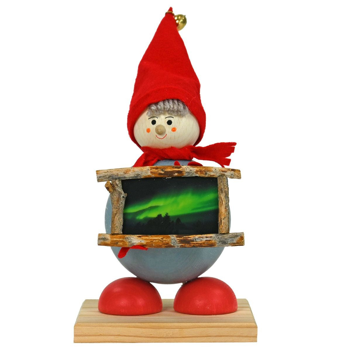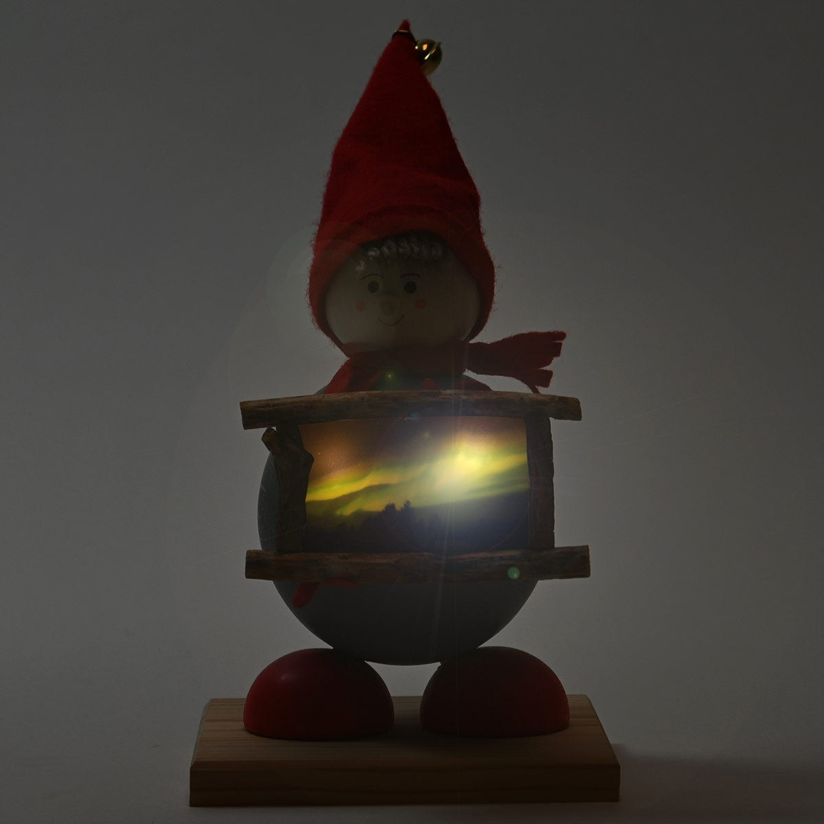 Tonttus are the lovable elves from Nordic folklore and the most important helpers of Santa. This joyful Tonttu gives you a glimpse of the northern lights all winter long as it holds a wooden frame of the magical green sky. Not only that, a switch on the bottom of the Tonttu's base lights up the frame to offer a colorful light display of aurora borealis. Standing about 8" tall from base to bell-top and dressed in a red hat, scarf and mittens, this festive Tonttu is ready to bring the holiday spirit and light up your home during the dark nights of winter.