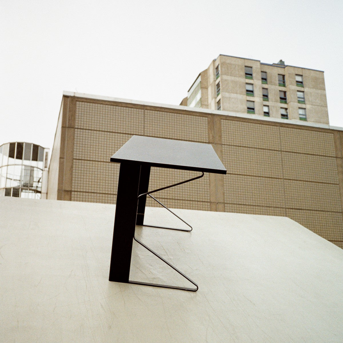 Designing brothers Ronan and Erwan Bouroullec were inspired by Aalto's patented L-shaped leg to create a component-based system for the Kaari series. In Finnish, Kaari means "Arch." The fluid outline has the lightness of a single pen stroke, but is sturdy with a strong design presence. It has 2 single pillar oak bases with steel half wings to give it even greater stability while saving space against a wall. A black linoleum tabletop serves as a sleek surface for working or studying, with your choice of a matching black lacquered or contrasting varnished oak base.