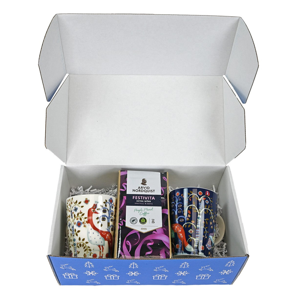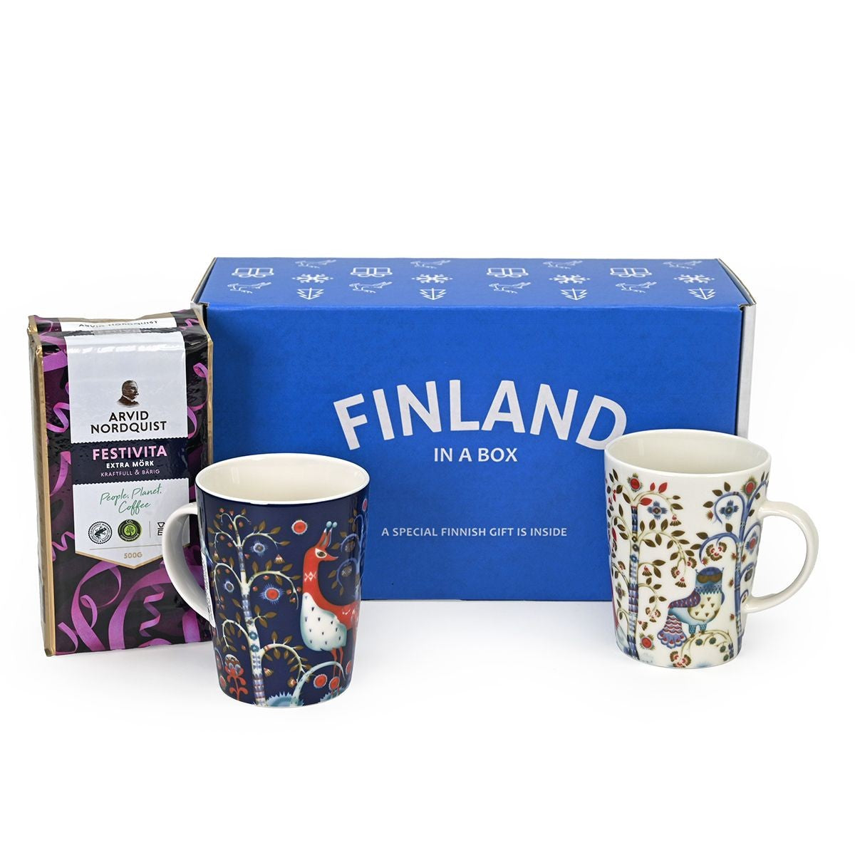 This is the ultimate gift set for a coffee lover. Did you know that Finland consumes more coffee than any other country? Roasted from 100% Arabica beans, this flavorful dark roast by Arvid Nordquist starts the day with an intensive aroma. It will be especially enjoyed with these two iittala Taika (Magic) mugs, featuring mystical foxes and owls in wintry white and blue colorways. Safely packaged with celebratory shredded paper in an exclusive FinnStyle gift box, this "Coffee Break" will delight any recipient!