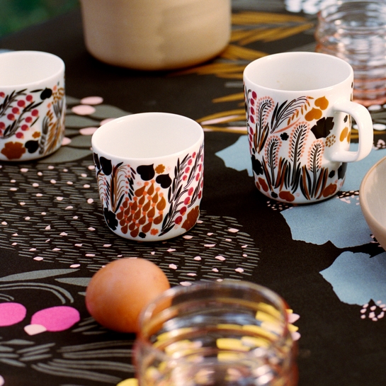 Dine from fields of flowers with this Marimekko dinnerware. It features Aino-Maija Metsola's Letto pattern of cattails and other plants in pretty shades of berry and peach pink, as well as chestnut brown and deep green. The white stoneware is microwave, oven, freezer, and dishwasher safe for convenient prep and clean-up of your daily snacks, desserts, sides, and more.