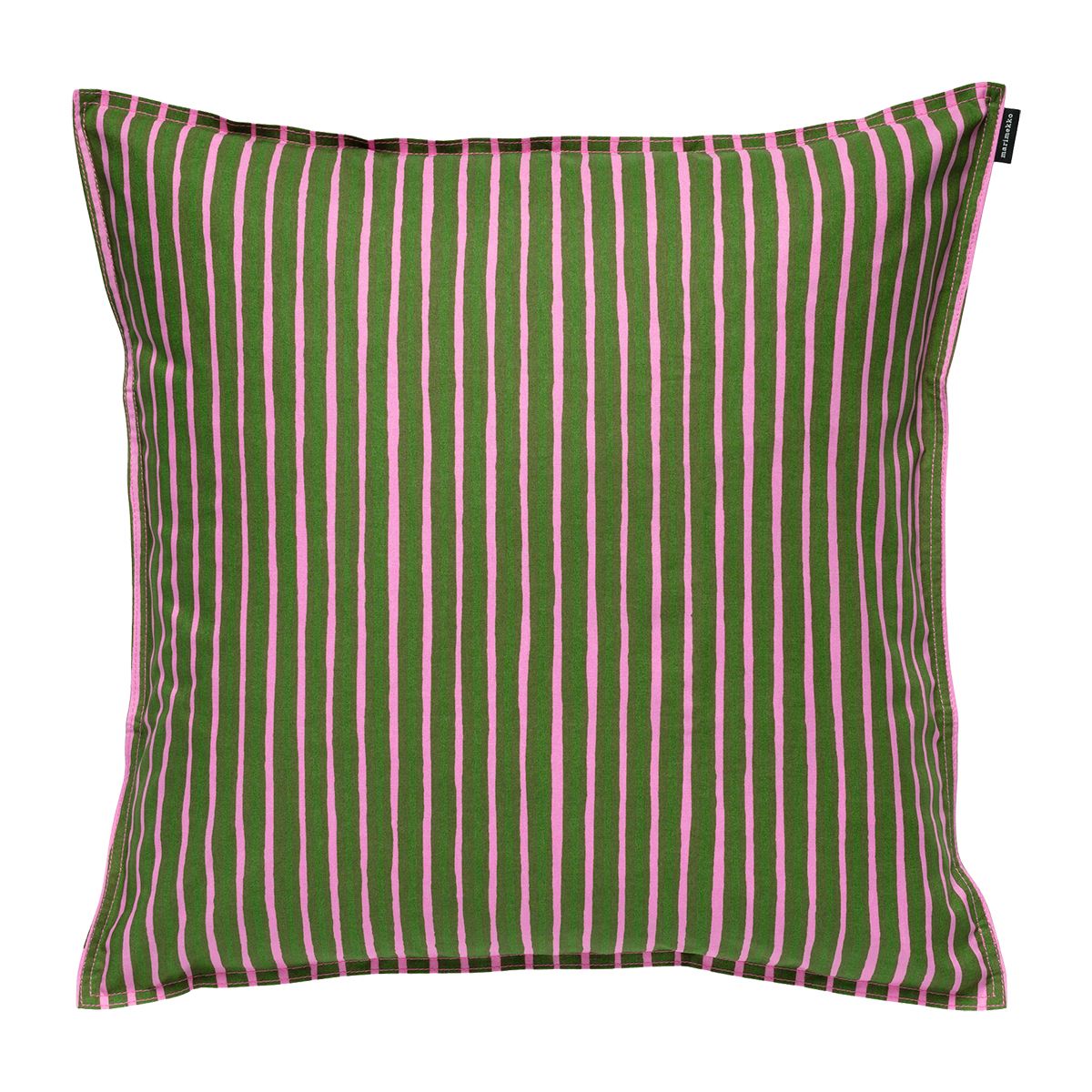 Designer Vuokko Eskolin-Nurmesniemi first created Piccolo in 1953, and it has represented Marimekko's legacy of iconic stripes ever since. Decorated atop this Marimekko throw pillow, the playful striped pattern is painted with vivid brushstrokes in fuchsia and green hues. The Marimekko Piccolo Throw Pillow will be a striking accent atop a bed, sofa, accent chair or bench, and is elevated with flanged edges on each end. Made from 100% cotton, the machine-washable pillow conveniently hides a discreet side zipper for easy removal of the cushion insert.