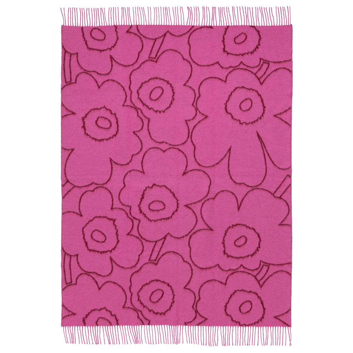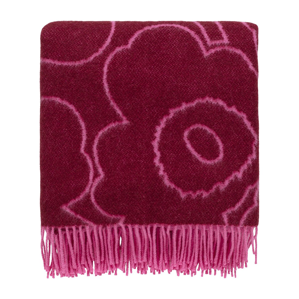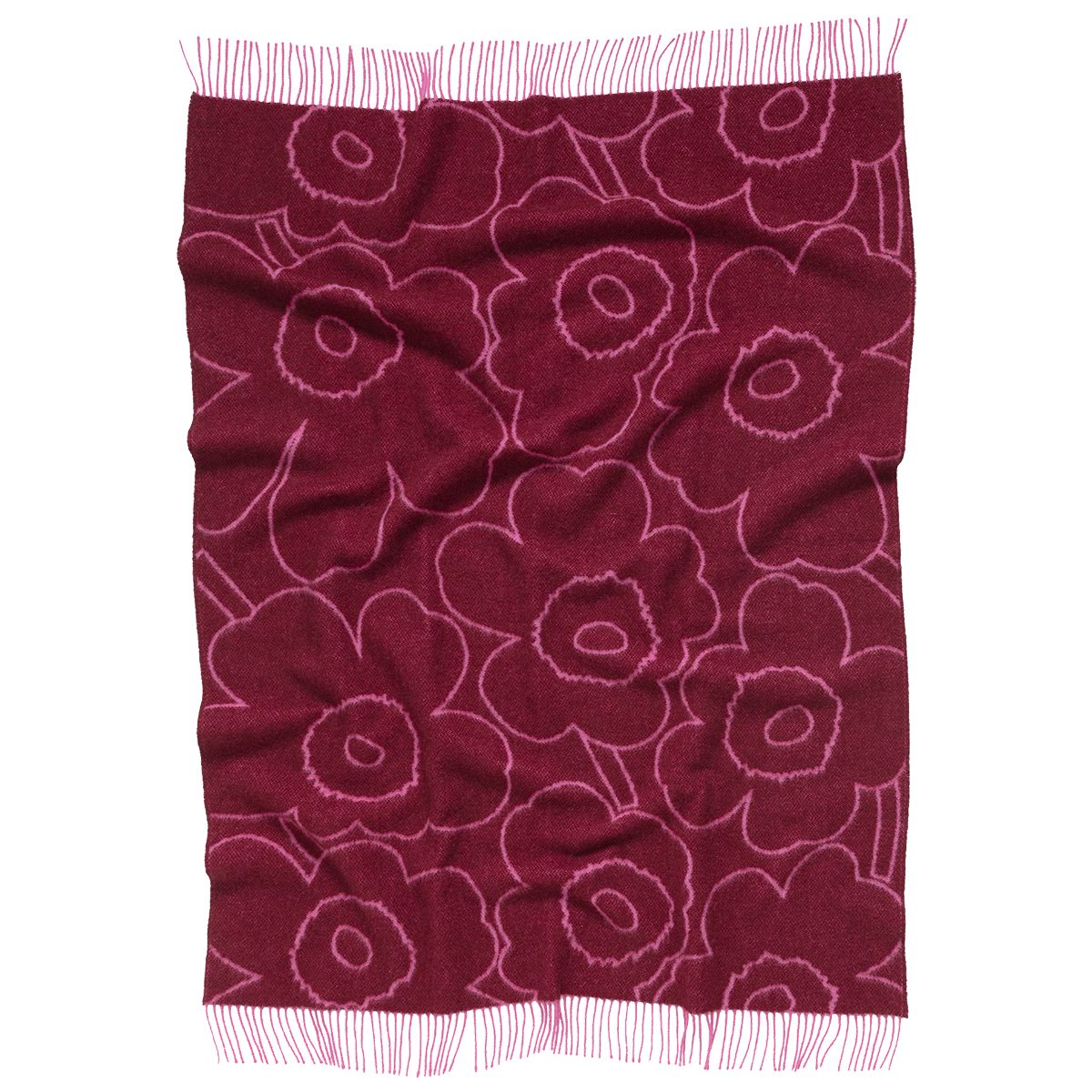 Captivating colors and timeless design make this Marimekko throw blanket a statement piece in any room. Piirto Unikko is a stylized and minimalistic variation of the beloved floral print created by Maija Isola in 1964, and the popular poppies are outlined in vibrant fuchsia atop a dark burdundy backdrop. The Marimekko Piirto Unikko Throw Blanket will look effortless draped across a bed or sofa, and feel even more joyful to snuggle up in with its 100% wool material. The colorway reverses on the opposite side of the blanket and it is woven with a jacquard knit for long-lasting use.