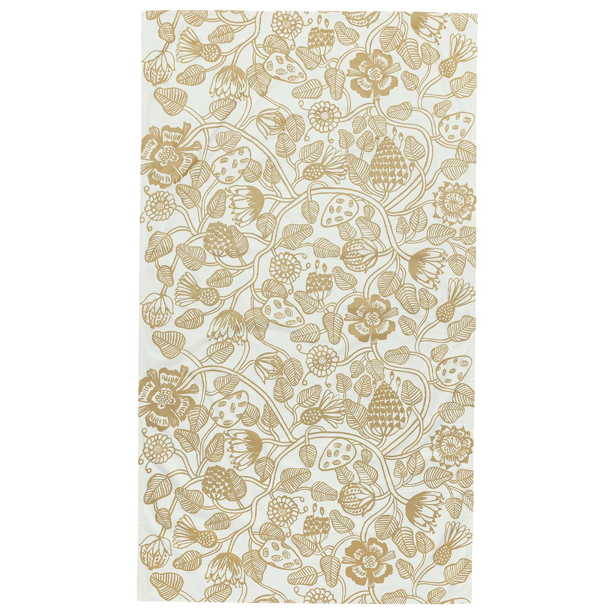 Combining modern florals with vintage appeal, Erja Hirvi's lush Tiara pattern brings in the beauty of northern nature to any interior. Perfect for both festive feasts and everyday dining, flowers and plants vine across this Marimekko tablecloth and illuminate against the white backdrop with golden metallic pigment. The Marimekko Tiara Gold / White Tablecloth is made from 100% cotton sateen, meaning it's produced using a satin weave to give it a smooth and lustrous finish.