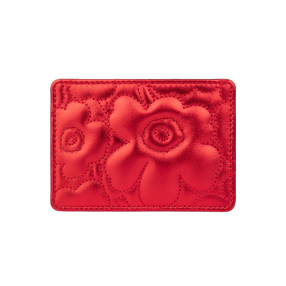 Compact in size but bold in style, carry cards and essentials with this vibrant Marimekko card holder. It's made from 100% leather with a metallic foil, which gives the card holder a shiny and lustrous finish. In a striking red hue, Maija Isola's beloved Unikko (Poppy) pattern is padded and topstitched for added texture and dimension. The Marimekko Unikko Shiny Red Card Holder has three total card slots, the debossed Marimekko logo on the back, and is packaged in a Marimekko logo drawstring bag.