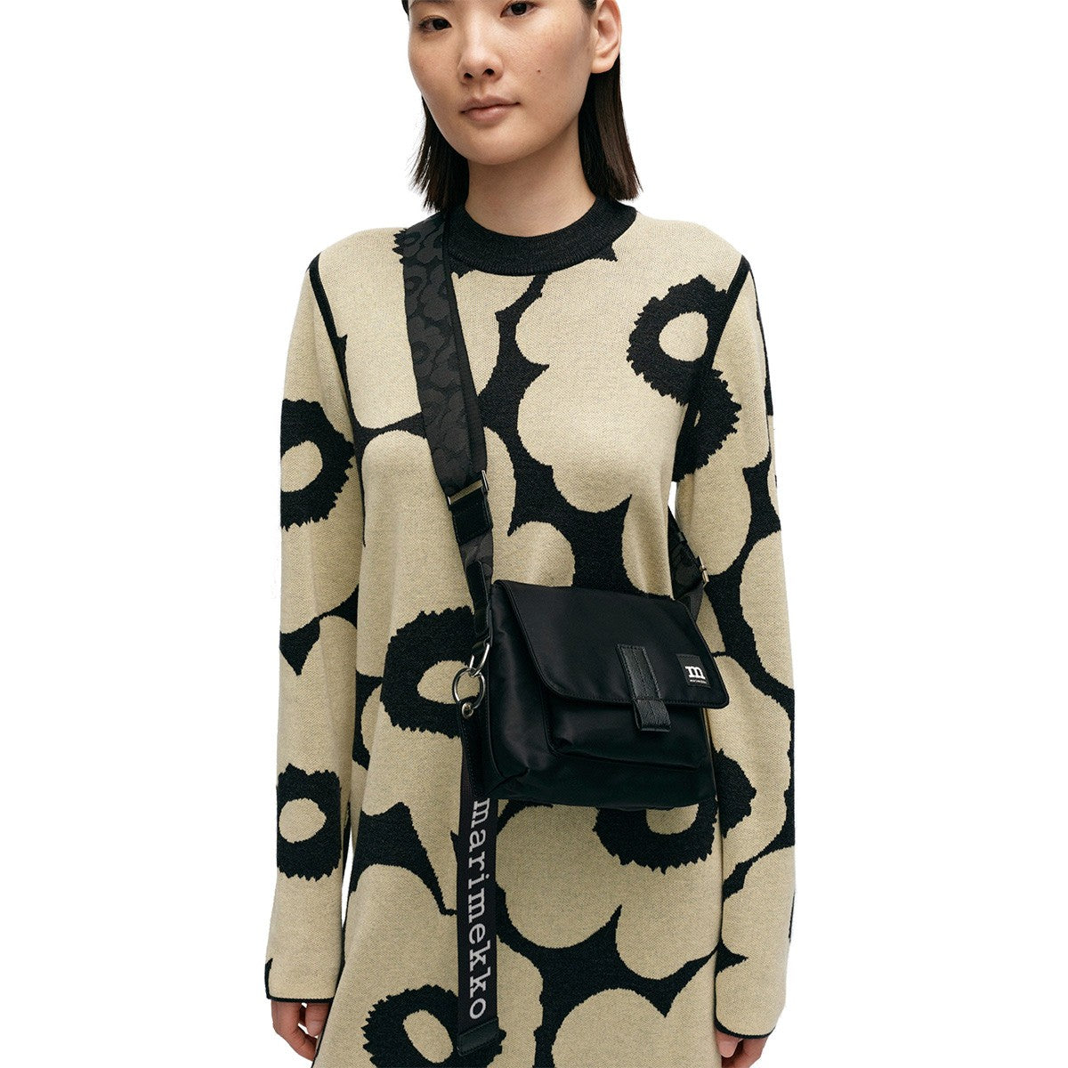 Whether you're traveling, running errands, heading to work or simply on-the-go, the versatile Marimekko Mini Messenger Solid shoulder bag truly does it all. Open the magnetic flap to find an open pocket for easy access to essentials and a larger compartment just above it that safely zips shut. All in a sleek, solid black colorway on the body, Maija Isola's iconic Unikko (Poppy) pattern subtly graces the adjustable shoulder strap with a jacquard knit weave. Attached on the Mini Messenger Solid is a removable Marimekko logo keychain with leather details.