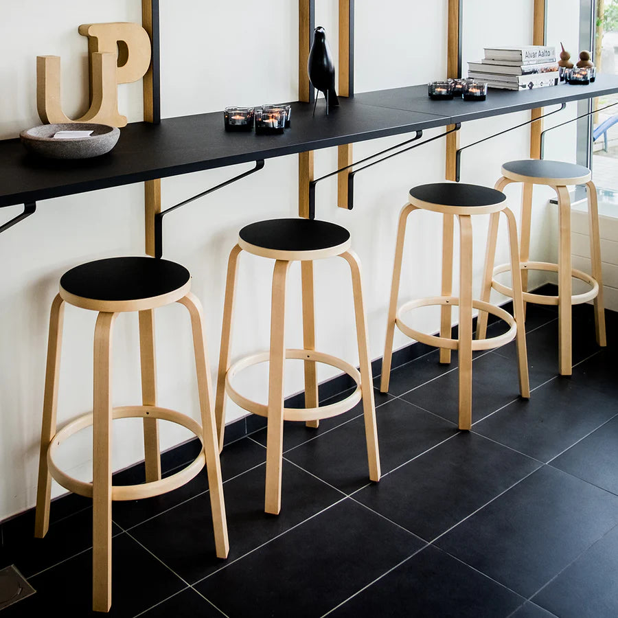 Pull up a seat at the counter or bar. The Aalto Model 64 kitchen/bar stool was first designed by Alvar Aalto in 1933. Taller in stature at 30", these stools are made of birch which can be all lacquered in black or white, left all natural, or decorated with a white laminate or black linoleum seat with birch legs.